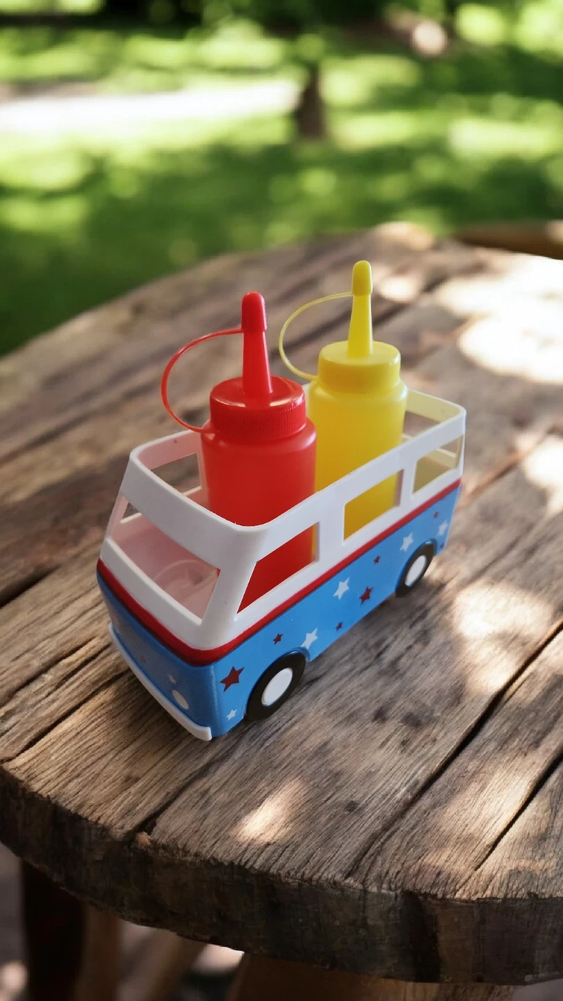 Cute bus-shaped holder for your ketchup and mustard squeeze bottles! It's made of plastic and perfect for BBQs or everyday use. Great for kids' meals or adding a fun touch to your table.