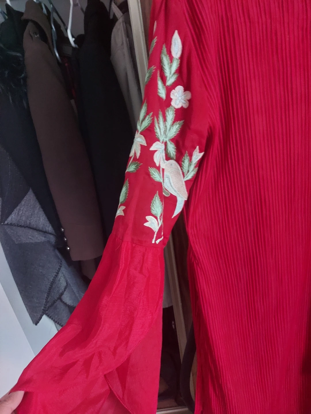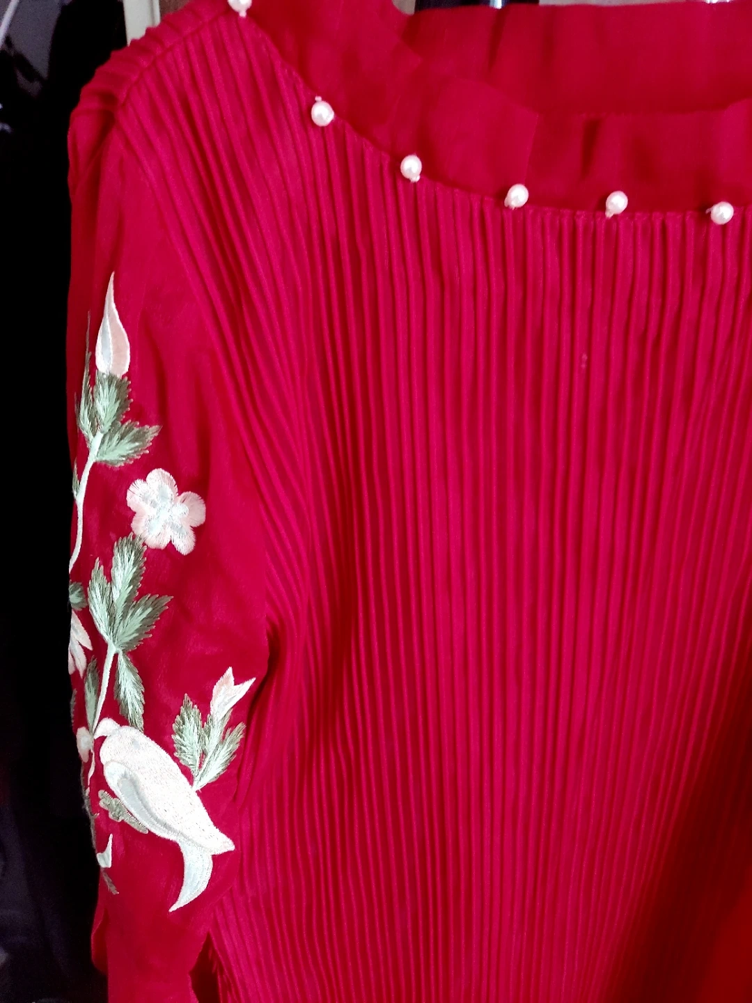 Bright red kurti with intricate embroidery on the sleeves and pearl detailing around the neckline. It features a pleated front and flared bell sleeves. Material is lightweight and flowy.