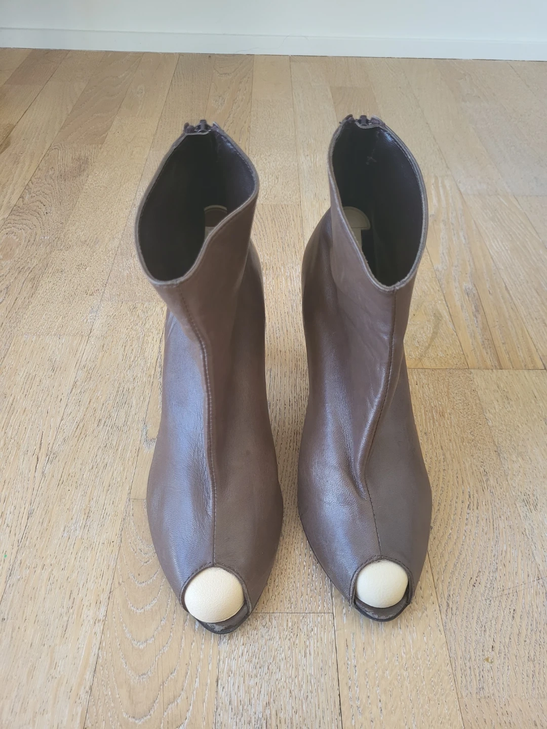 Minelli peep toe ankle boots made in Italy. Brown leather material, size 39. These stylish boots feature a zip closure at the back.