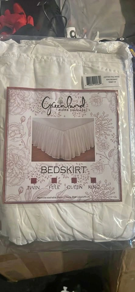 New Greenland Home Fashions bedskirt in white cotton voile. King size, measures 78x80+15 inches. Machine washable.