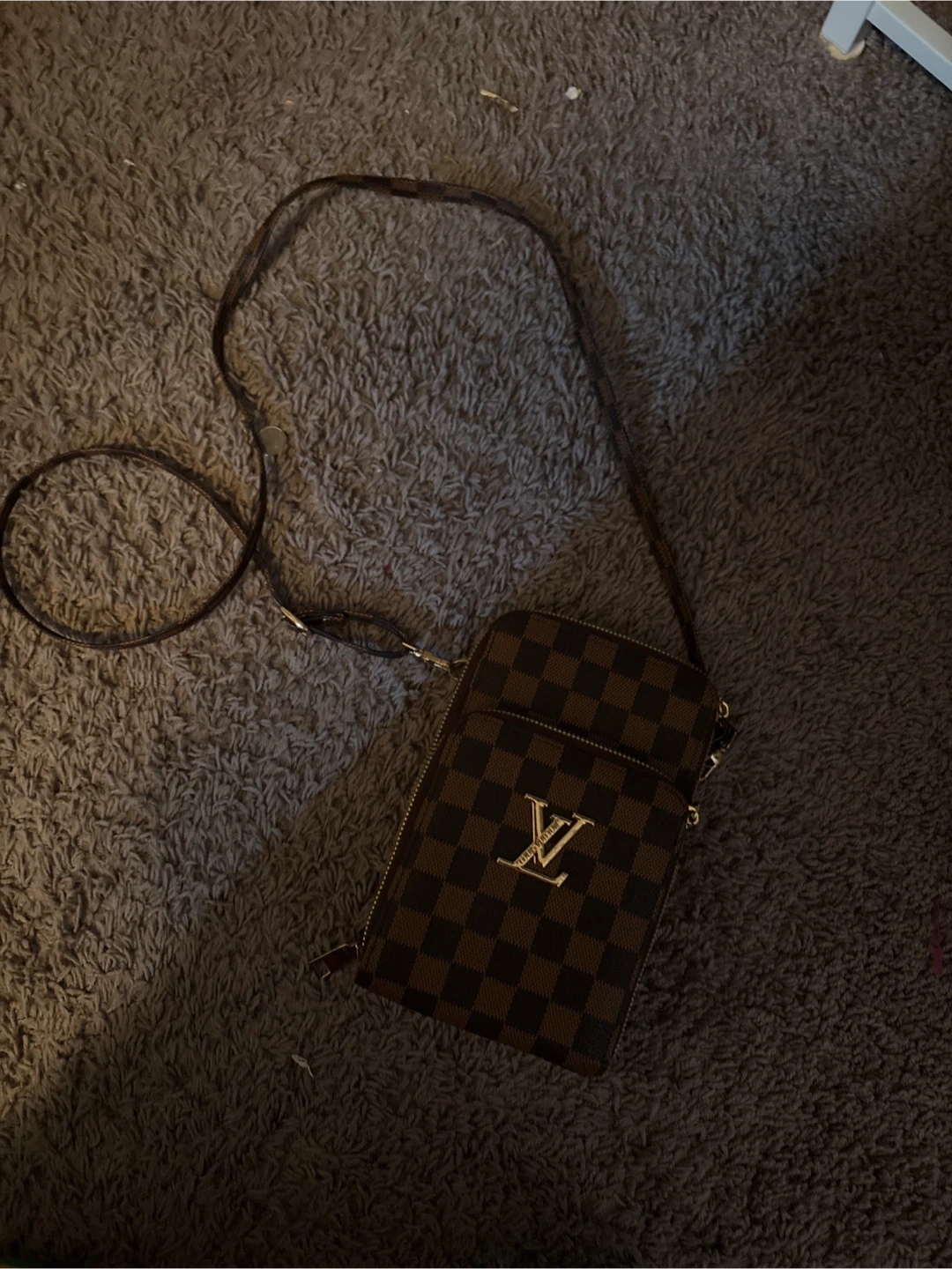Brown Louis Vuitton monogram canvas crossbody bag. Gold-tone hardware. Zipper closure on main compartment and front pocket. Adjustable strap.