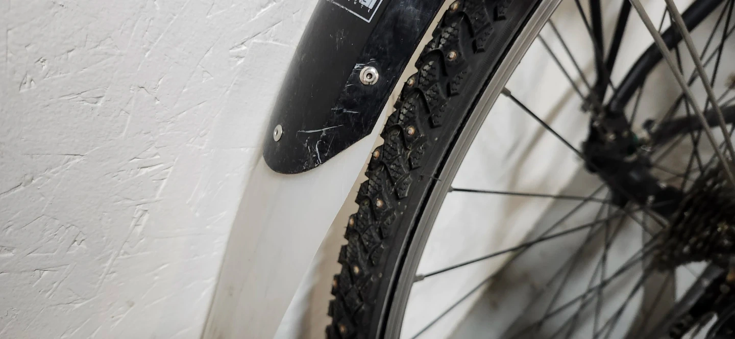 This is a black Norco mountain bike. It includes fenders and a rear rack. It's ready for winter riding with studded tires, locked on quick release, mud guards with extensions, rack, new saddle