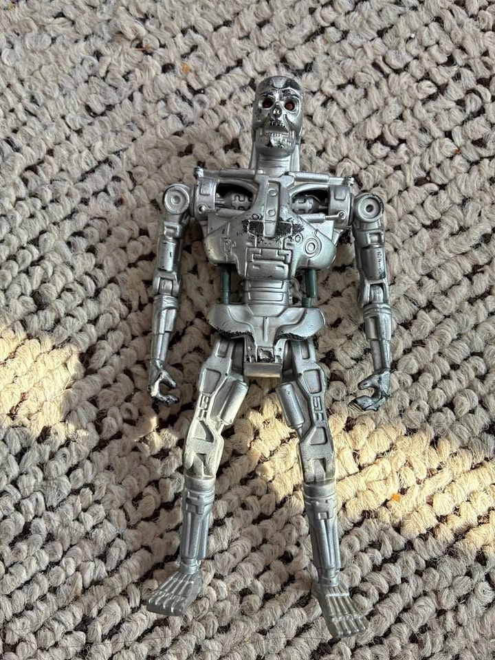 This is the T-800 Endoskeleton from the Terminator 2 movie. It features a "Techno-Punch" action where twisting the upper body makes the arms swing. The figure is about 5 inches tall and has a light-piping feature for the eyes. Please note there is paint wear and damage on the right side.