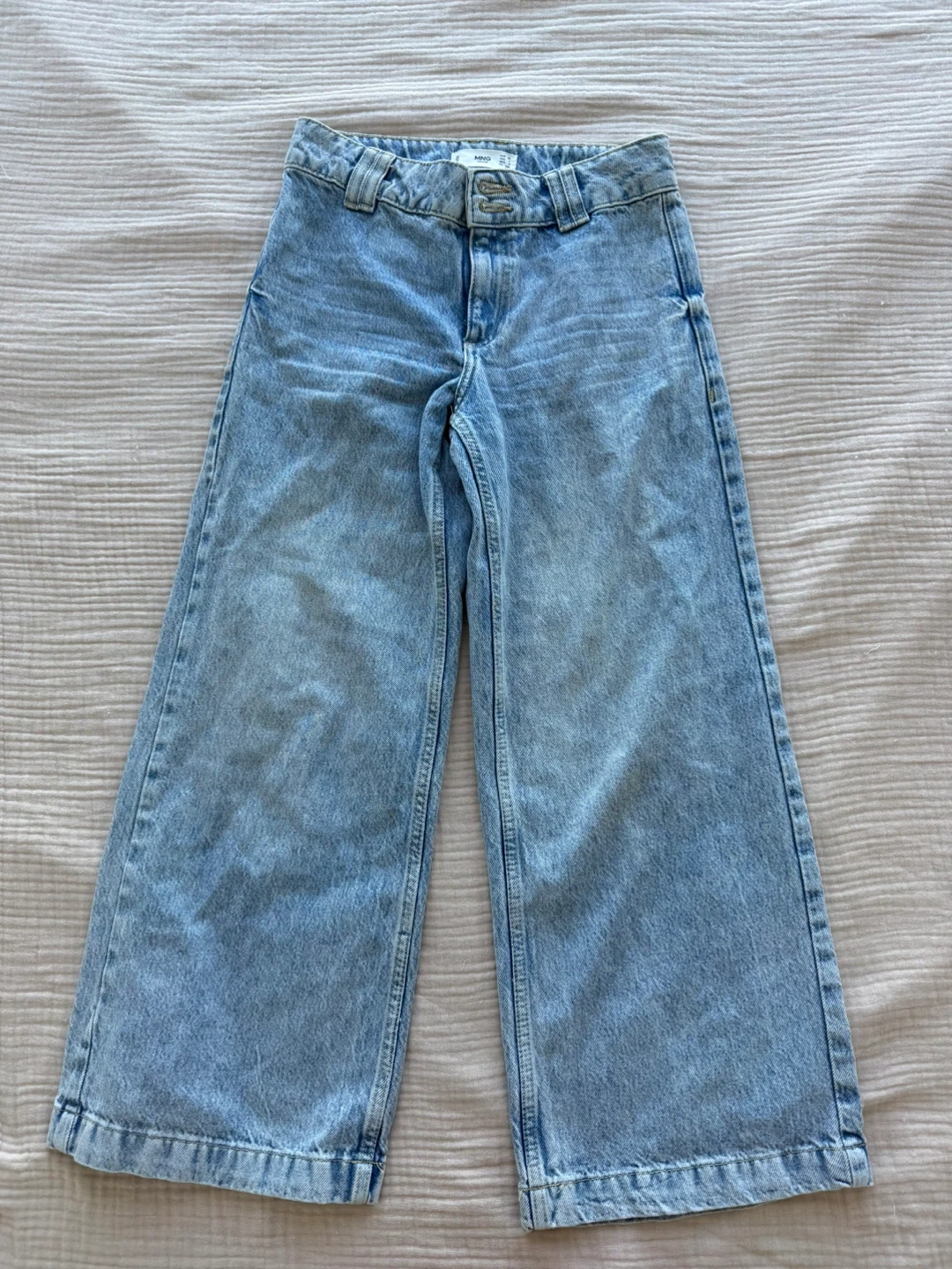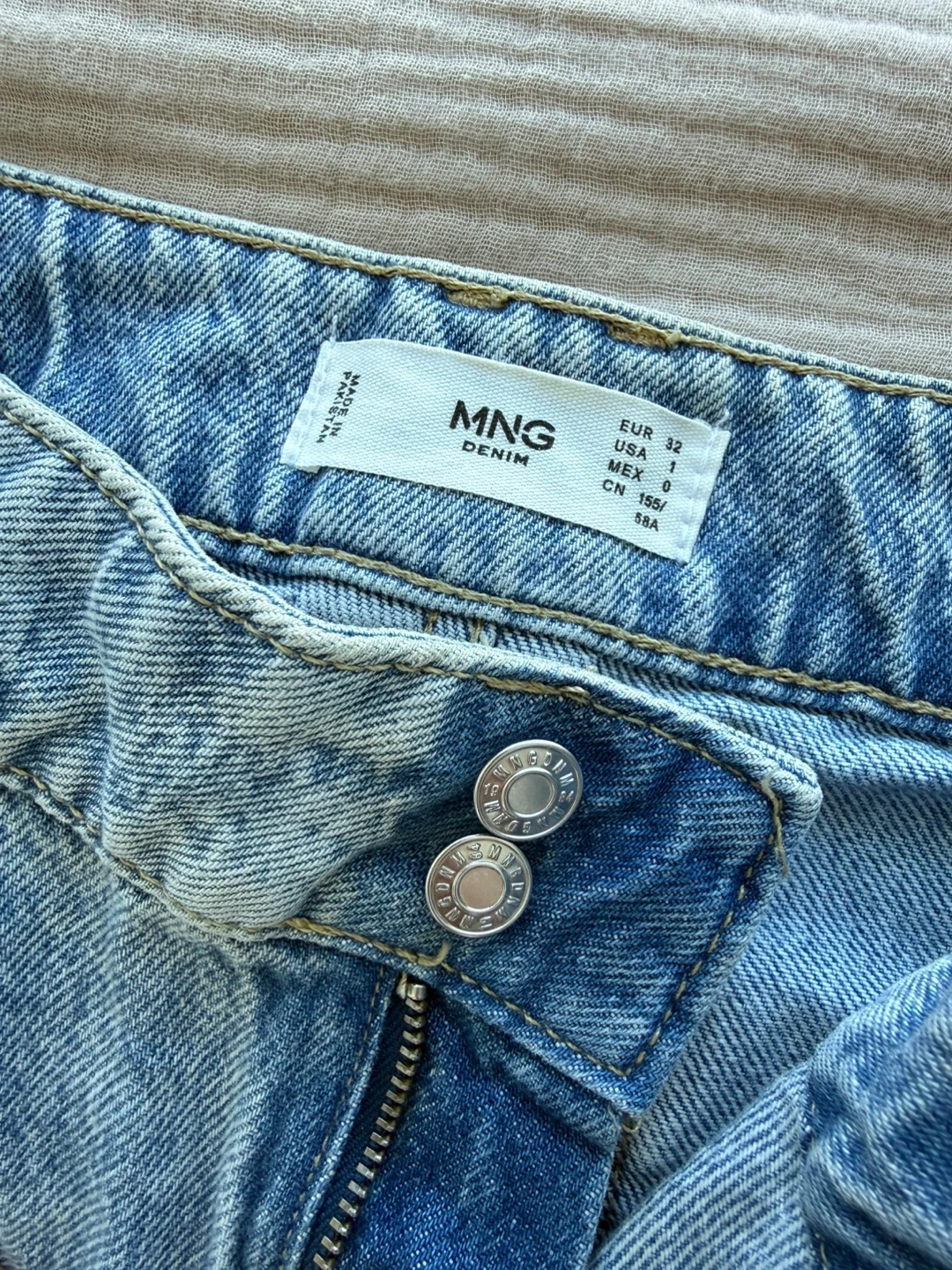 These MNG denim jeans have a light wash and a wide leg fit. They're a size 0 with a zip fly and button closure.