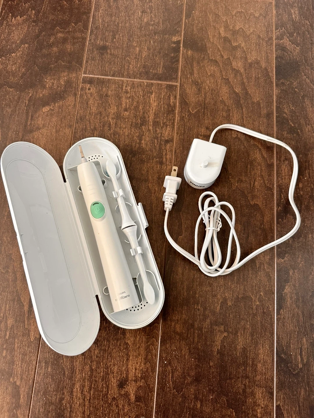 This Philips Sonicare electric toothbrush comes with a travel case and charger. It does not include the two brush heads, for picture purpose only.