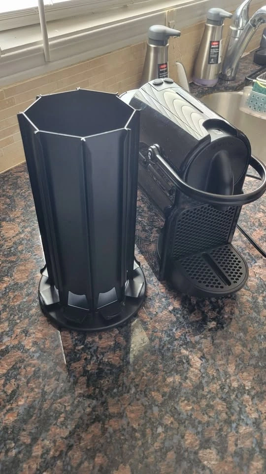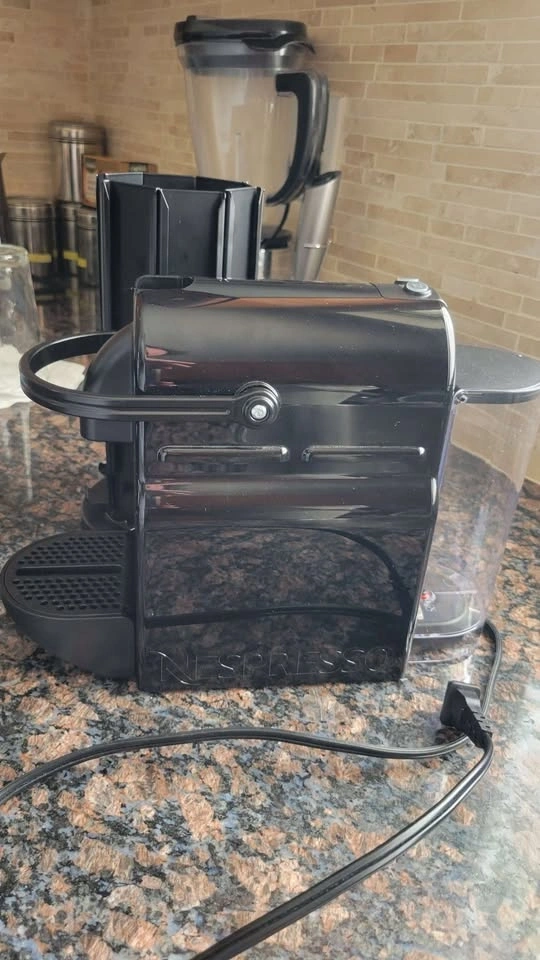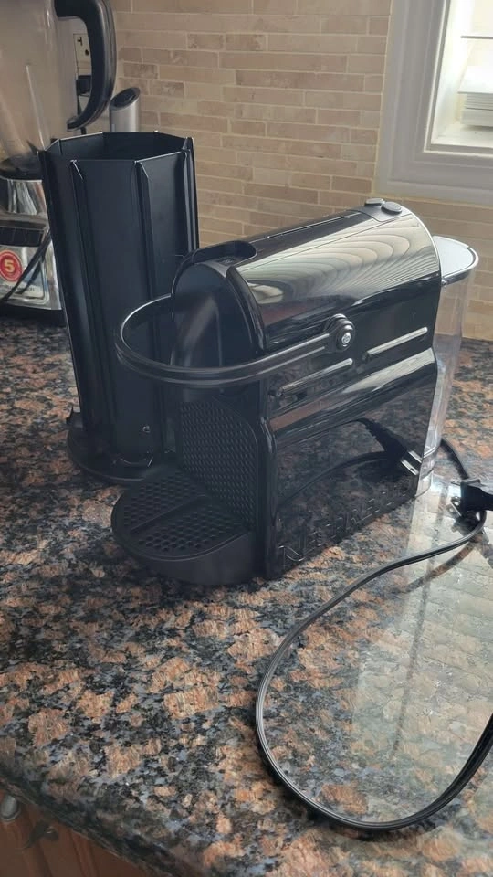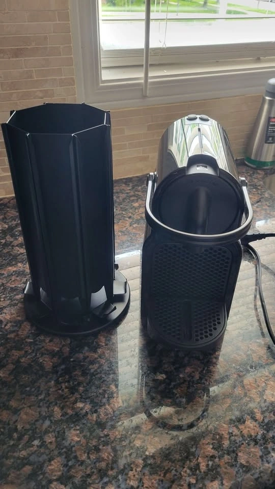 Very good condition. Comes with the pod carousel holder storage. This Inissia Black Original Nespresso Coffee Machine has 2 cup sizes (40ml/110ml), a removable water tank capacity of 0.7 liters, and a used capsule container capacity of 9-11. Original price was $209. Included is a Pod Holder for Nespresso Original Pods with Central Additional Pods Storage (Carousel-80+ Pods), originally priced at $36.