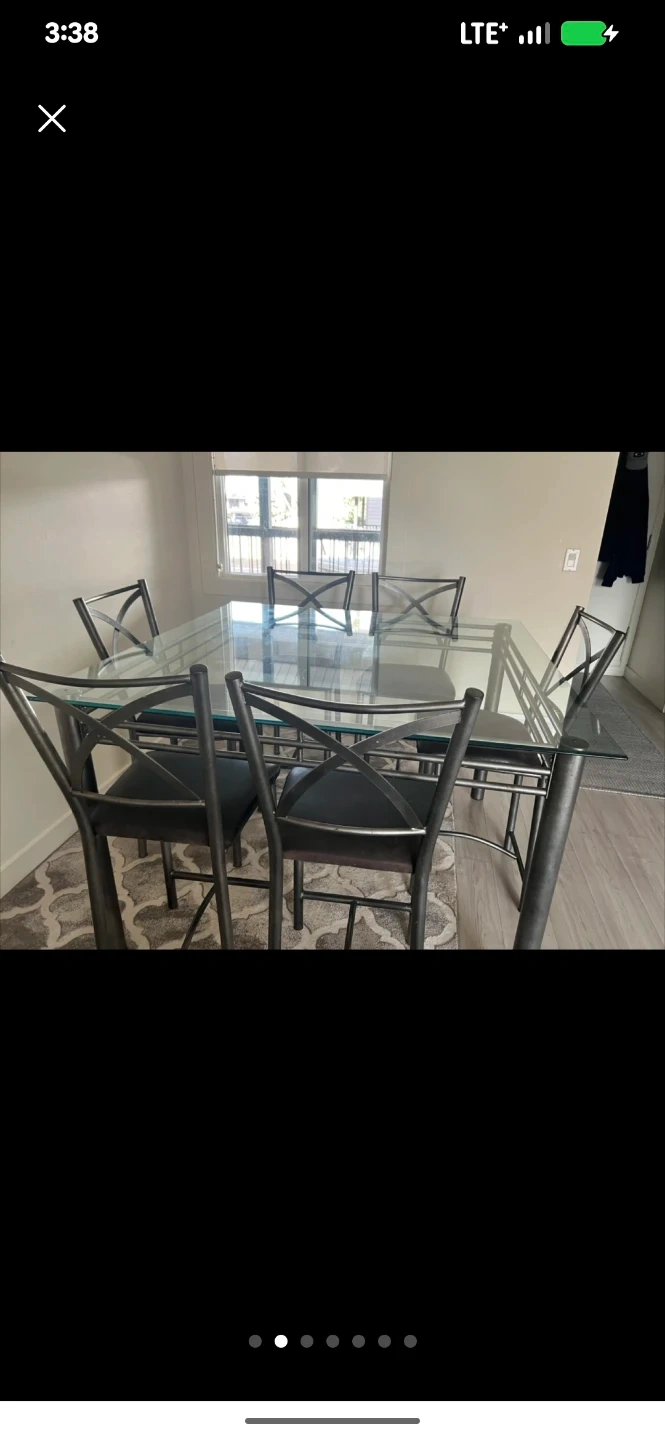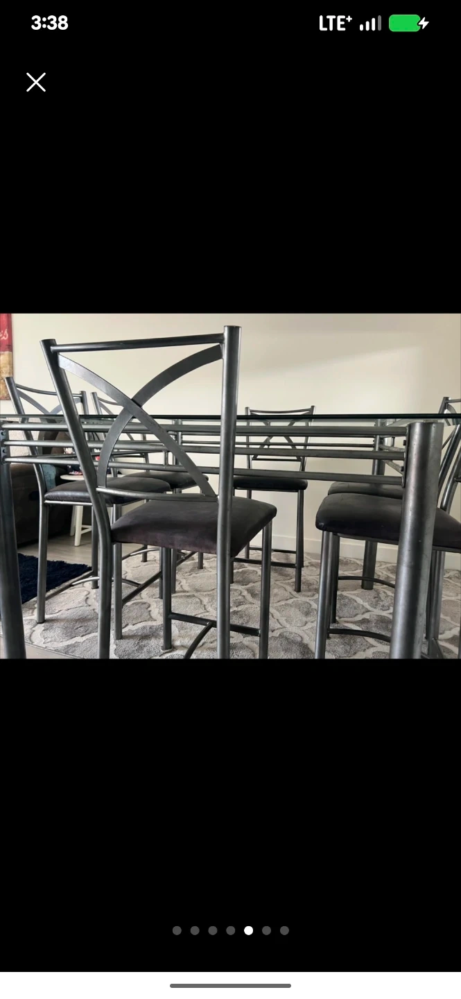 This dining set includes a glass-top table with a metal frame and six matching chairs. The chairs have upholstered seats for comfort. It's perfect for family meals or entertaining guests. Solid glass table and chairs perfect condations