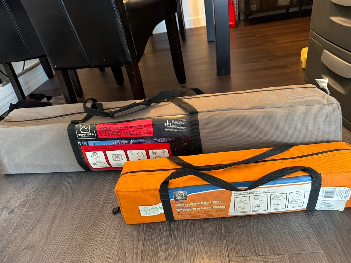Ventura Instant Hybrid Dome Tent with dimensions 3.04m x 2.74m. It's a two-person tent. Also includes a Ventura Scout Junior Dome Tent. Both are bundled in their carrying bags.