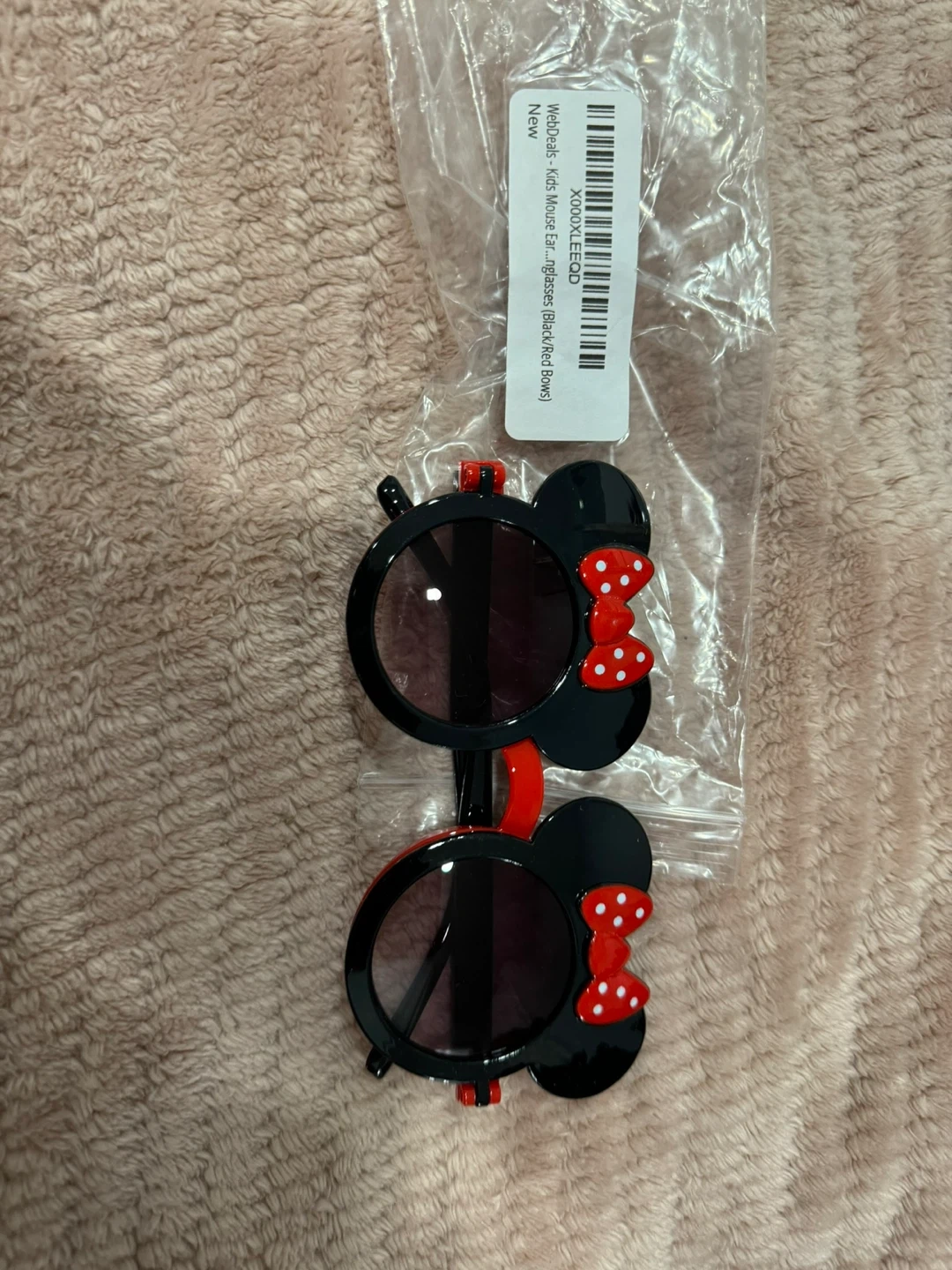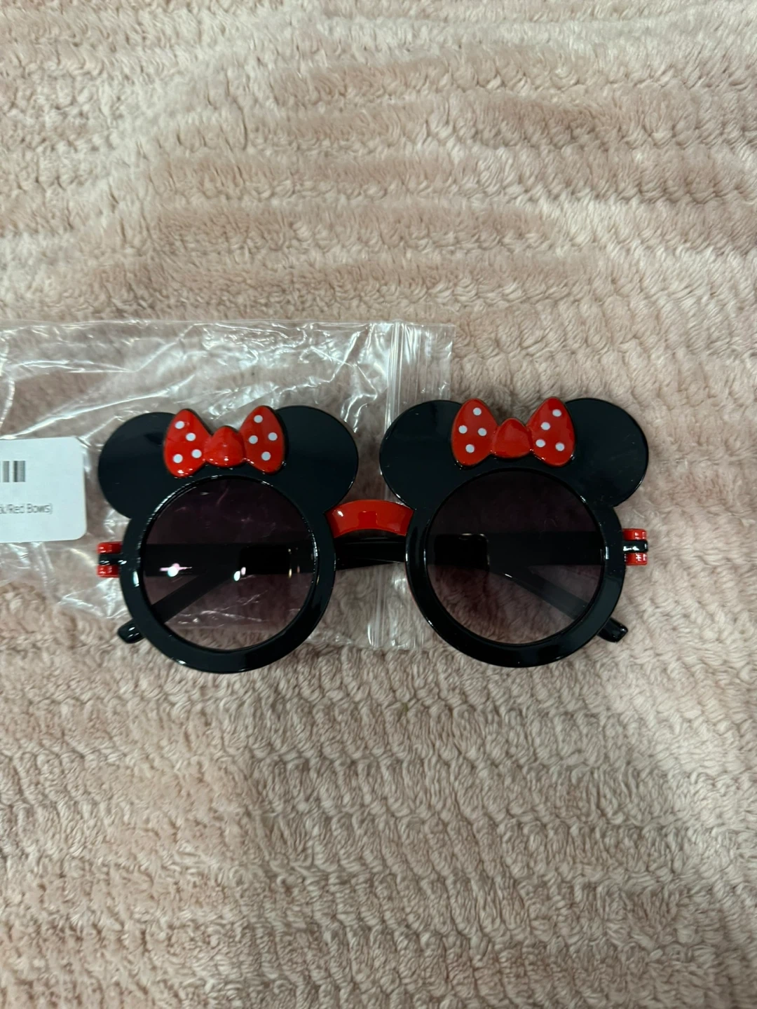 These adorable kids' Minnie Mouse sunglasses are brand new and still in their original packaging! They feature a cute black frame with red bows. Perfect for keeping your little one stylish and protected from the sun