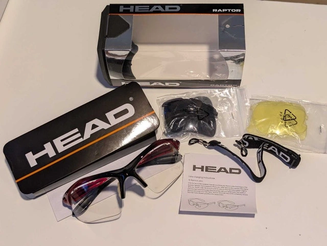 Get ready to elevate your game with these like-new HEAD Raptor sports glasses, perfect for any athletic endeavour! These glasses feature interchangeable lenses, including clear, yellow, and dark lenses, ensuring optimal vision in various lighting conditions. The set also includes a HEAD-branded lanyard and lens changing instructions, all in the original packaging.
