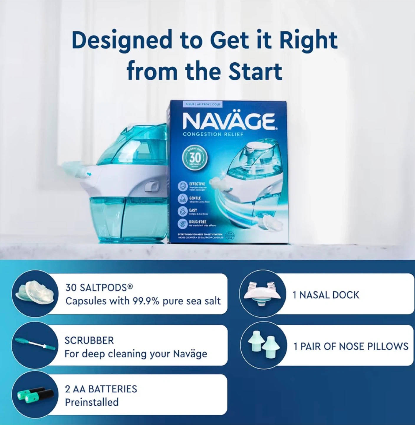 New Navage Starter Bundle - Nasal Irrigation System - Saline Nasal Rinse Kit with 1 Navage Nose Cleaner and 20 Salt Pods