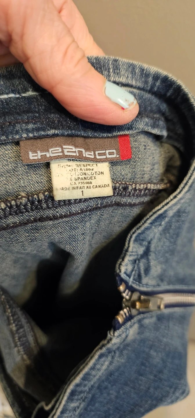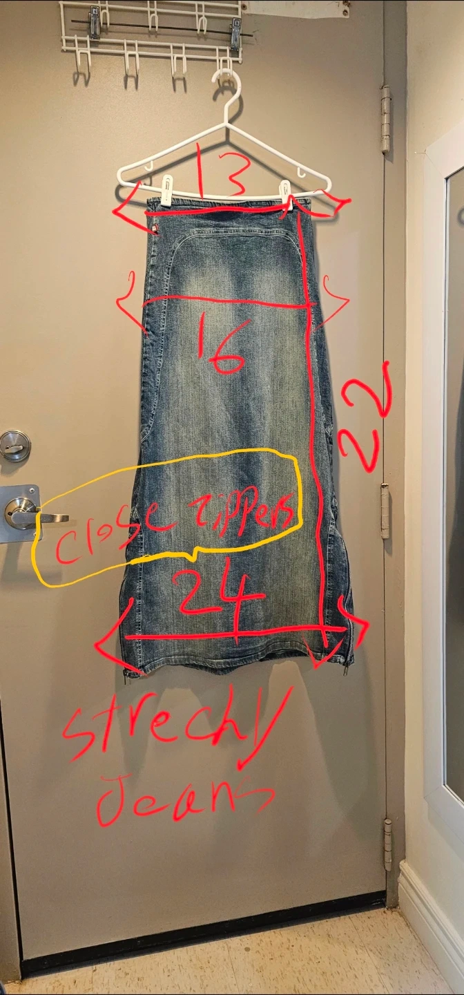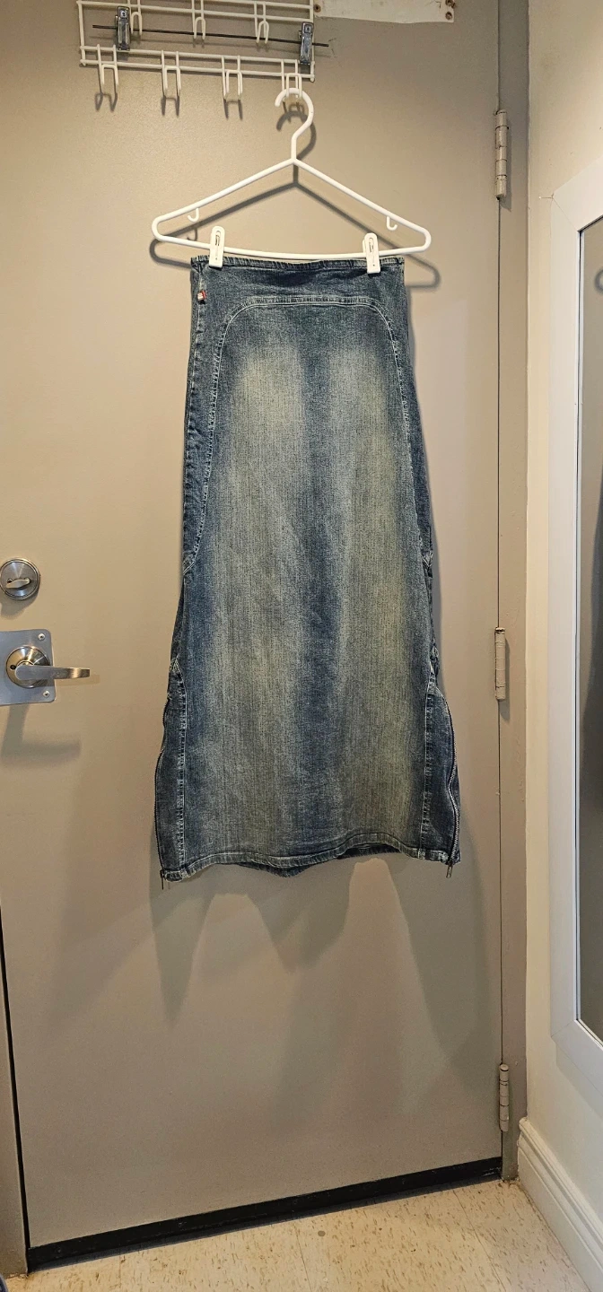 Maxi denim skirt from thee.co. It's a stretchy jean material. Features a full-length zipper closure and a flared hem with a zipper detail. Cotton and spandex blend. Made in Canada.