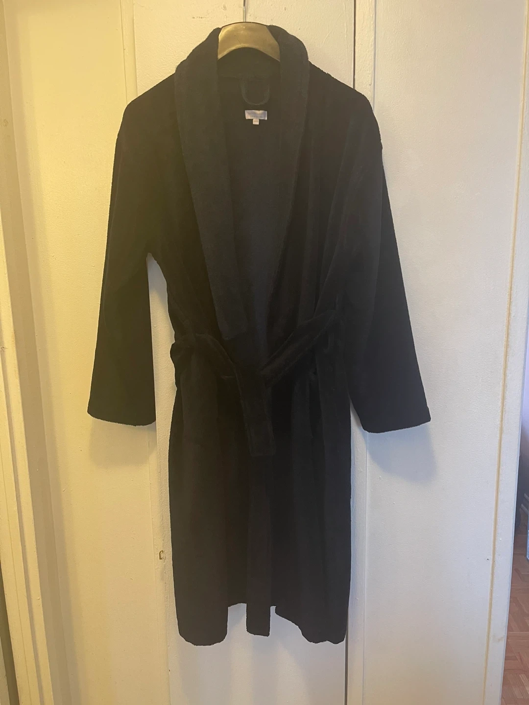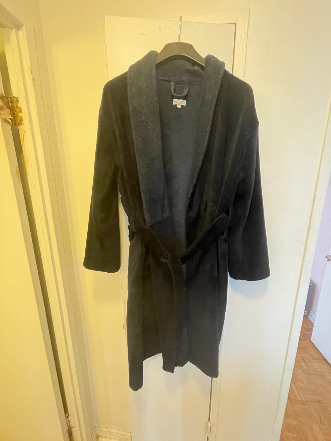 Cozy robe made from Turkish cotton and poly-plush blend. This S/M size robe is dark blue . It's perfect for relaxing at home.