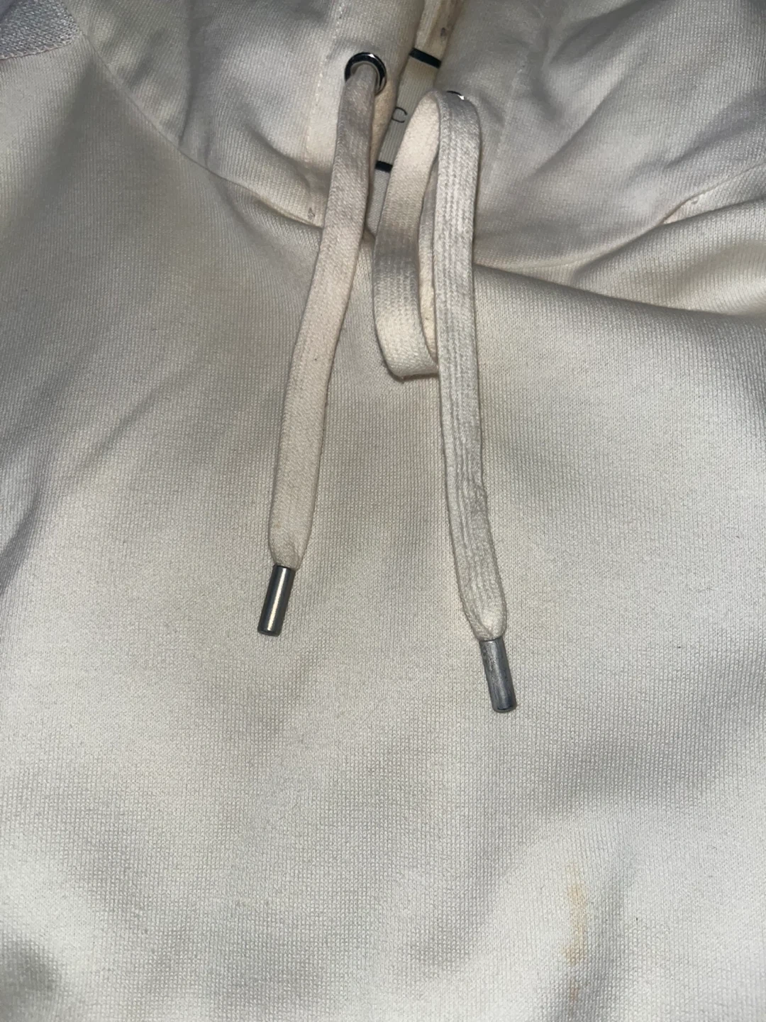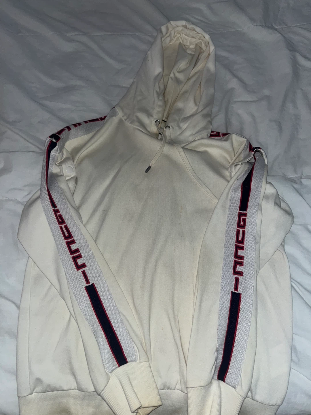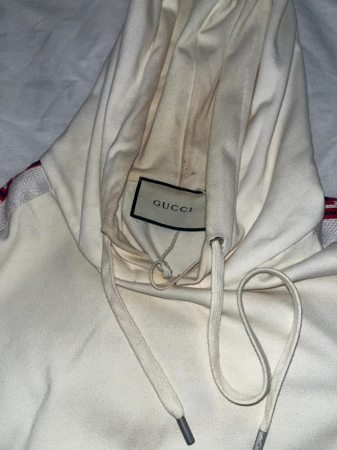Cream Gucci hoodie with logo tape on the sleeves. It has some minor staining on the front and inside the hood, as shown in photos. Made from a comfortable cotton blend.