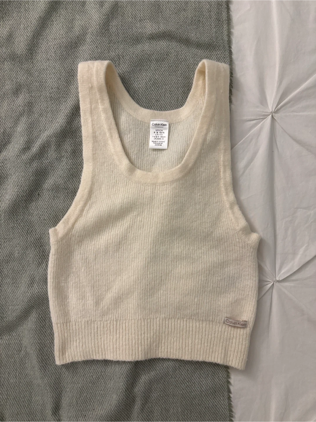 Cream coloured Calvin Klein ribbed cropped tank top. Made from a soft knit material. It's a stylish layering piece for any season!