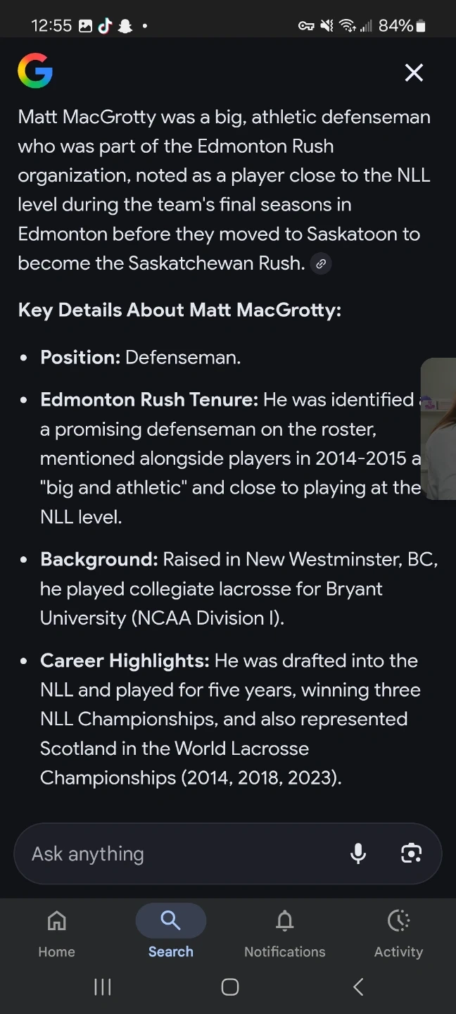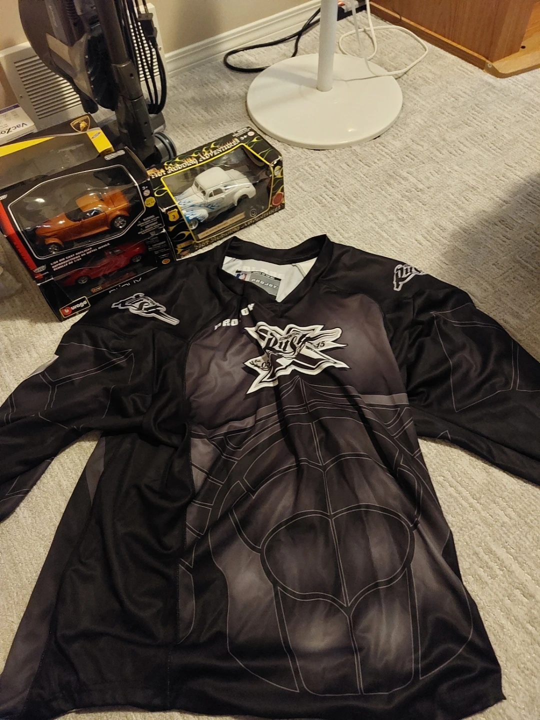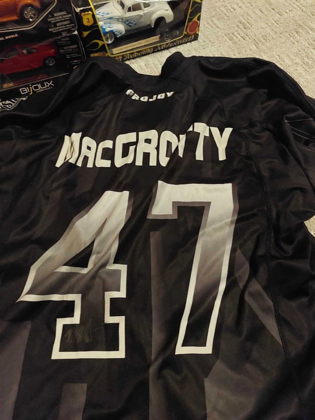 This is a PROJOY jersey with MacCrotity and the number 47 printed on it. It's black with white lettering and accents. A white plastic bag with '#47 Matt MacCrotty' written on it is included. This is the only one 1of1 special jersey that was auctioned off for charity and I won highest bid it is signed on the back and has never been worn