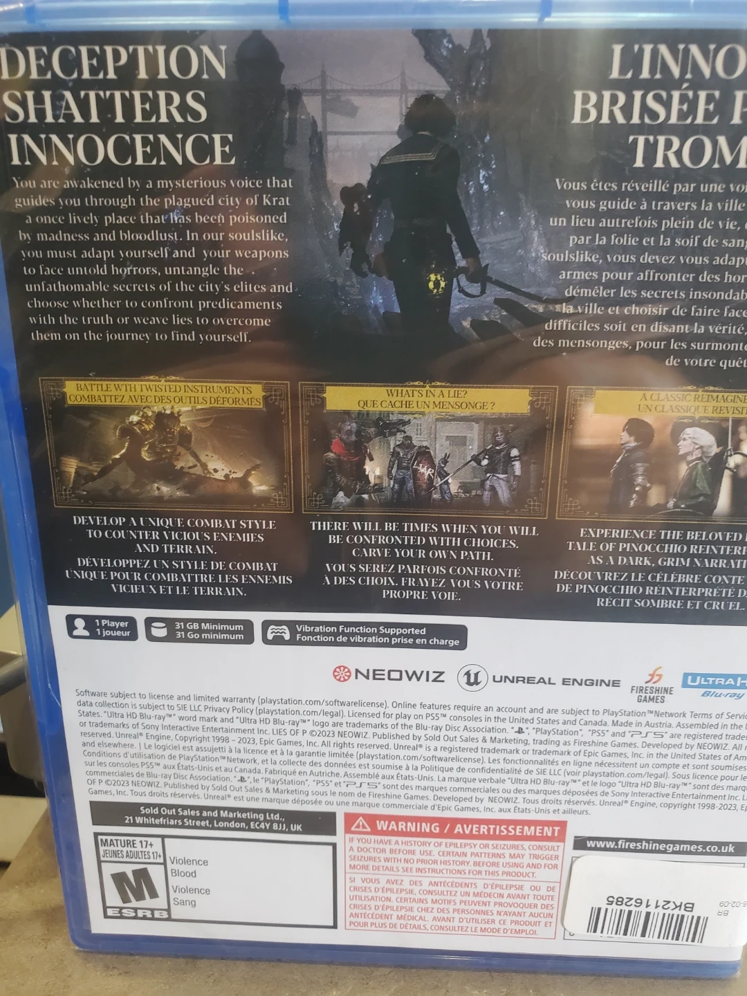 This is the Lies of P video game for PlayStation 5. It's an action game set in a dark Belle Époque city. The game involves combat with twisted weapons and unique lies.