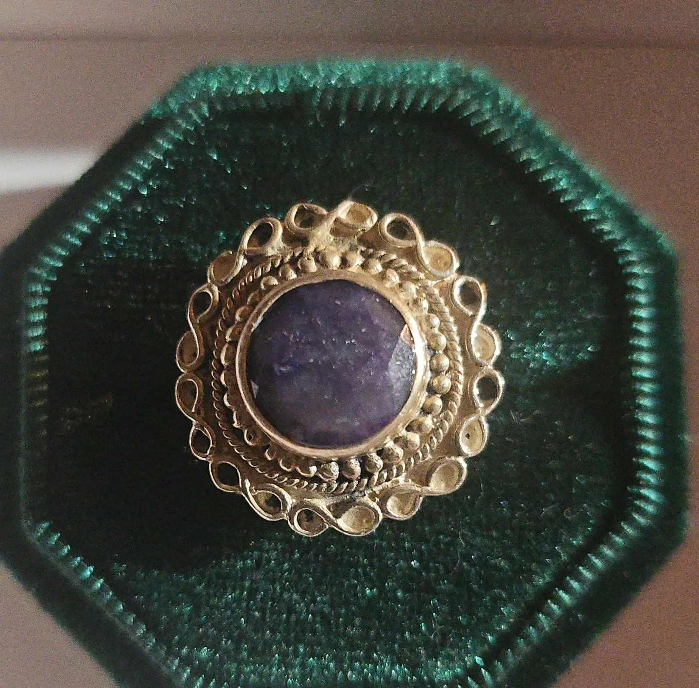 This Blue Lapis Stone set in sterling silver has an intricate and eye-catching design. Silversmithing done in the Balmoral Studio.