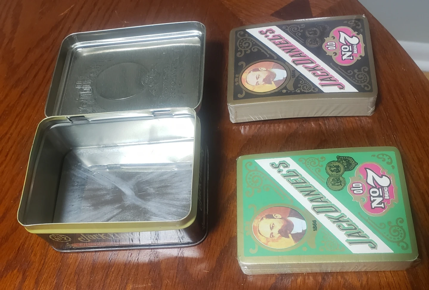 This is a set of Jack Daniel's Old No. 7 brand playing cards. It comes with two decks of cards and a collectible tin. The tin is decorated with the iconic Jack Daniel's imagery. Great for card games or as a collector's item!