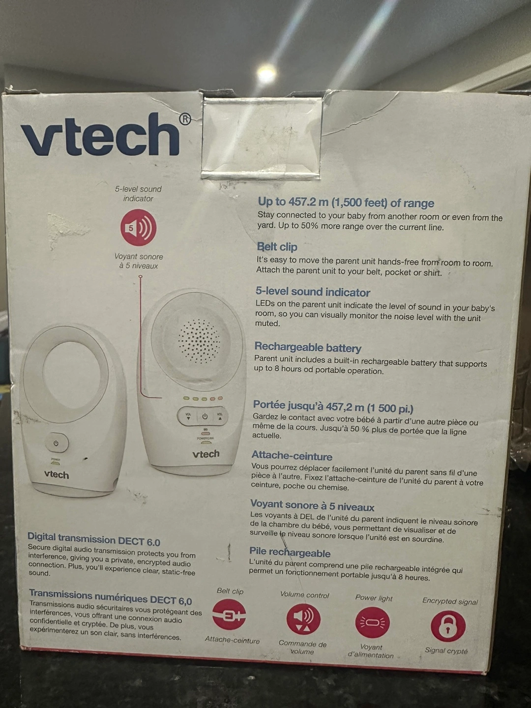 Digital audio baby monitor. Enhanced range. Features rechargeable battery, belt clip, and 5-level sound indicator. Up to 457.2 m (1500 feet) range.