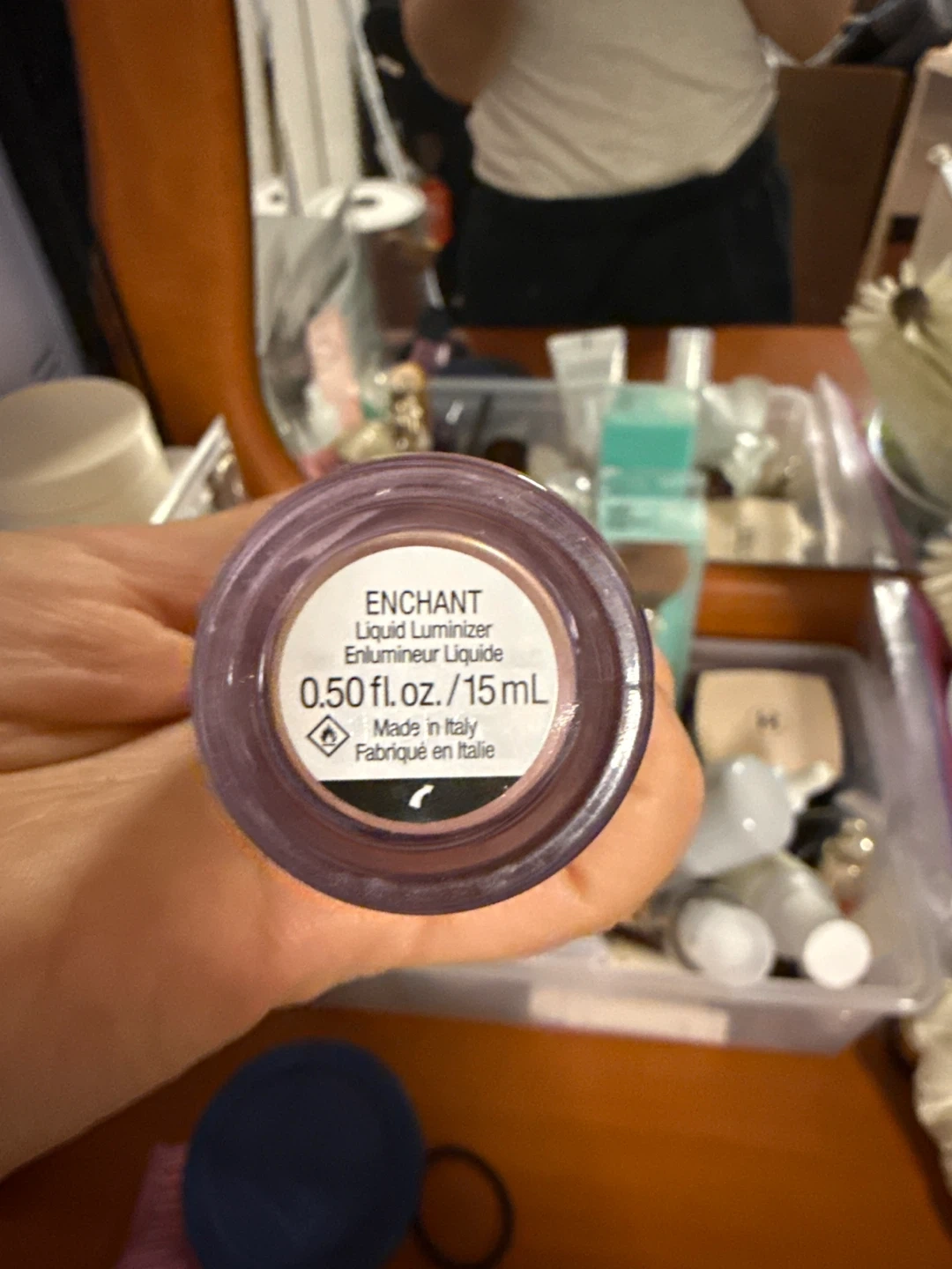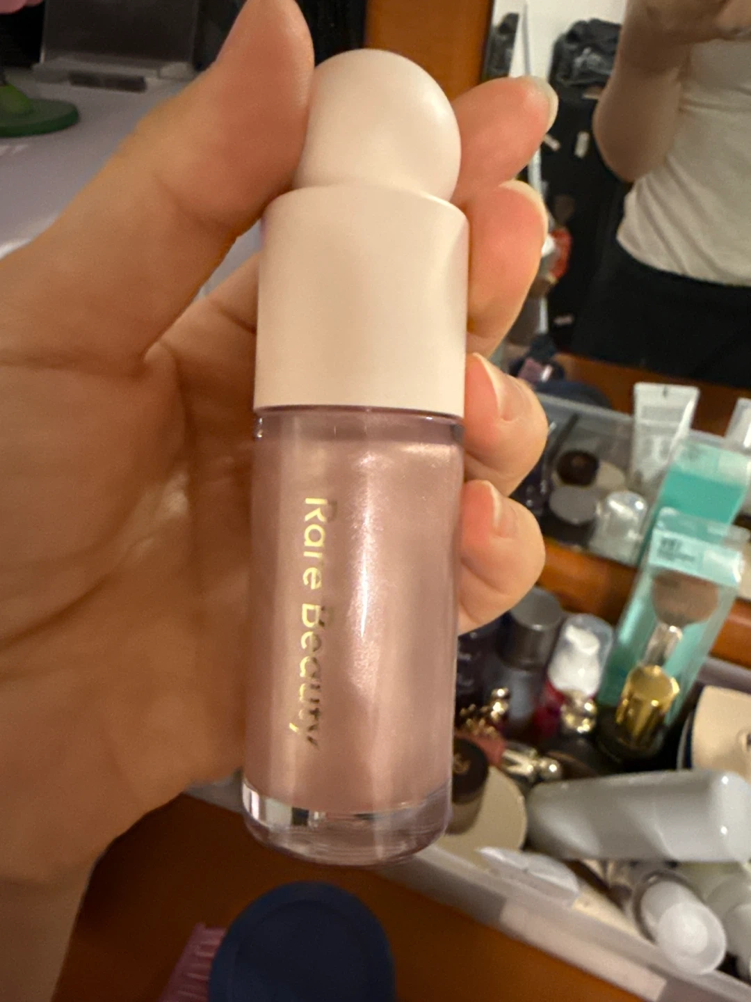 This is Rare Beauty's Enchant Liquid Luminizer. It's a liquid highlighter with a pearly finish. Contains 0.50 fl. oz. / 15 ml.