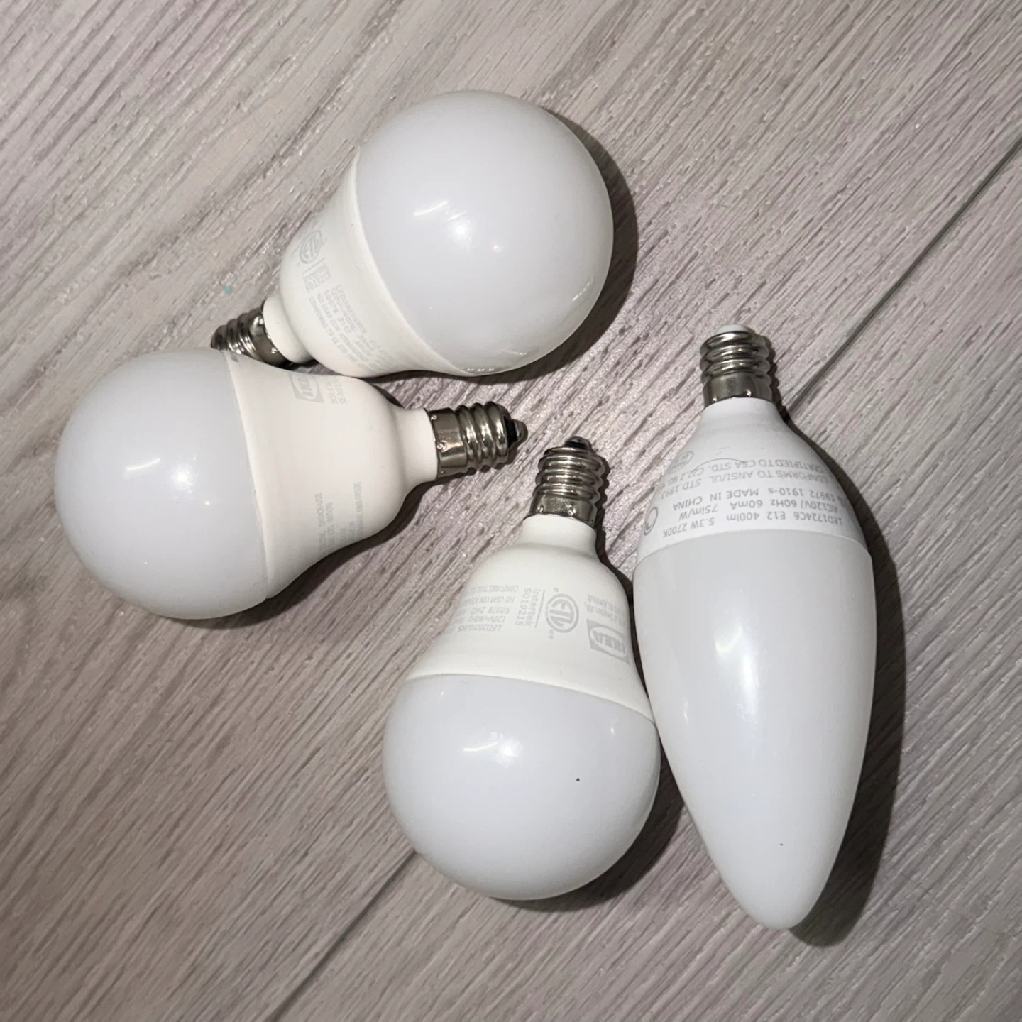 Four IKEA LED light bulbs included. AC 120V, 5.3W, producing 400 lumens with a 2700K warm white colour. Made in China.e14