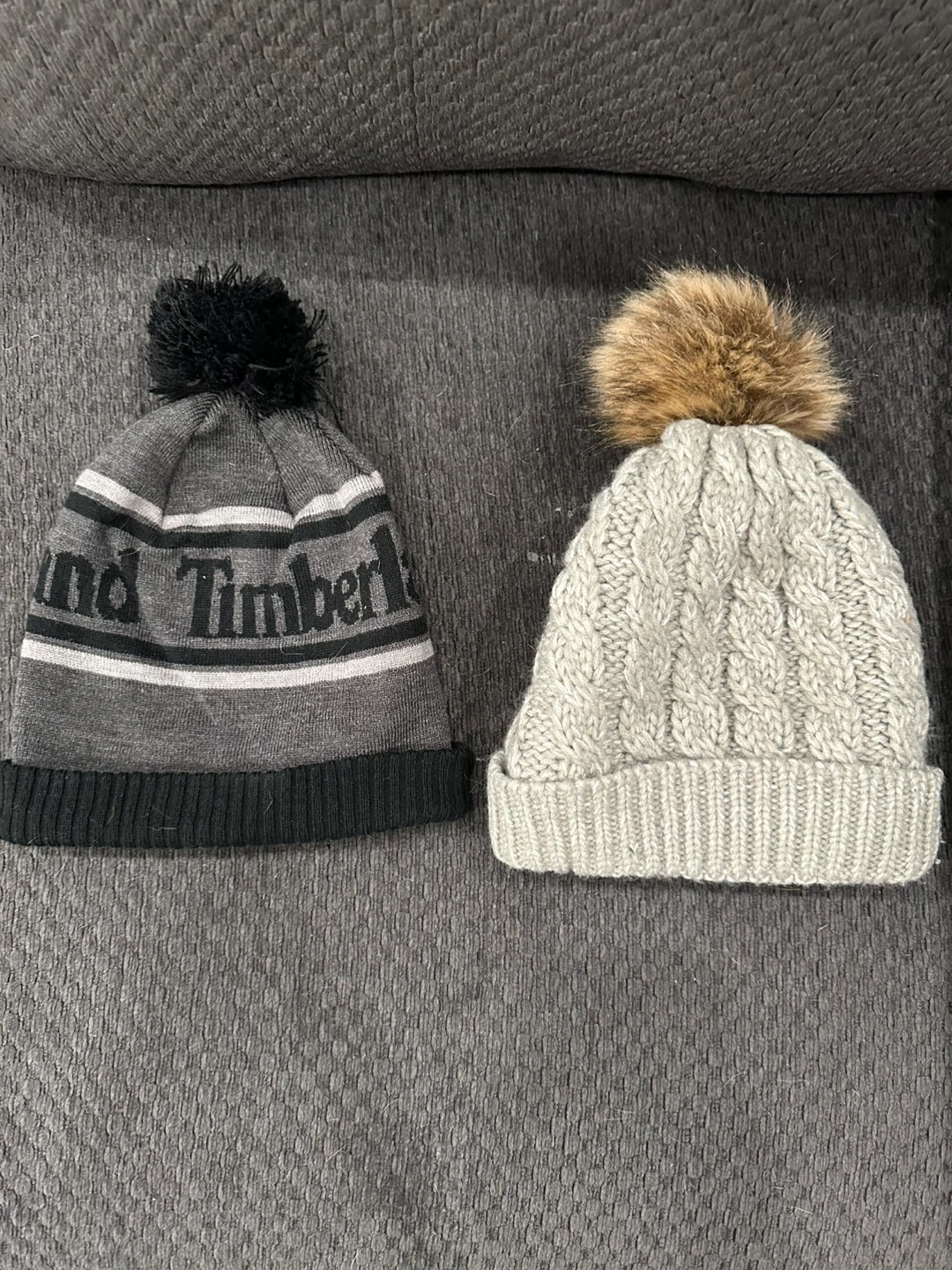 Two beanies for sale! One is a Timberland beanie with black, grey, and white stripes. The other is a grey knit beanie with a faux fur pompom. Both are in great condition. One size fits all