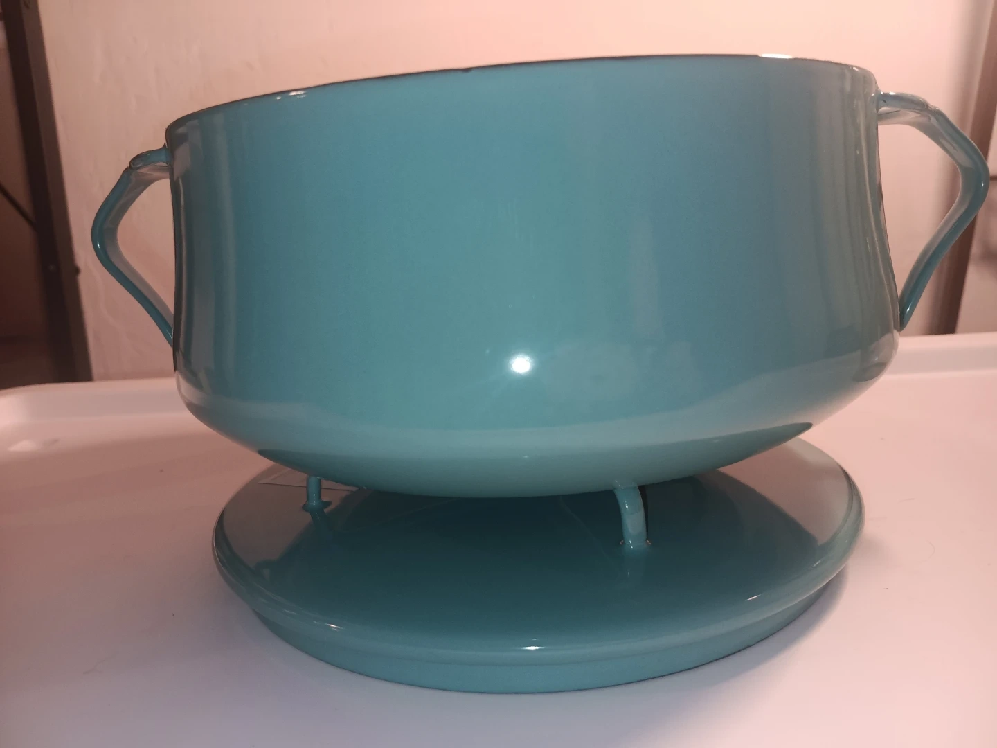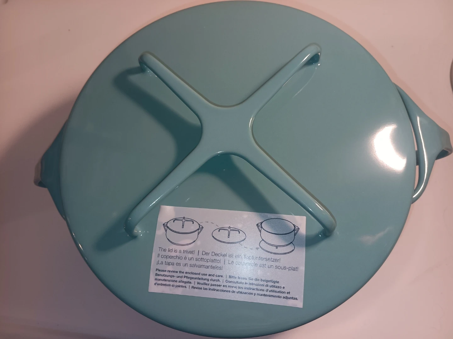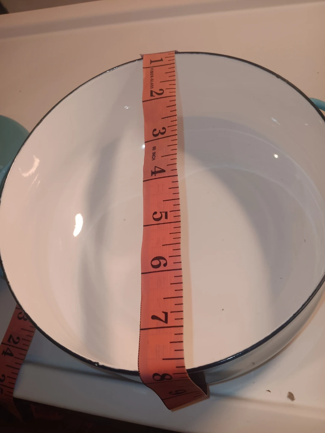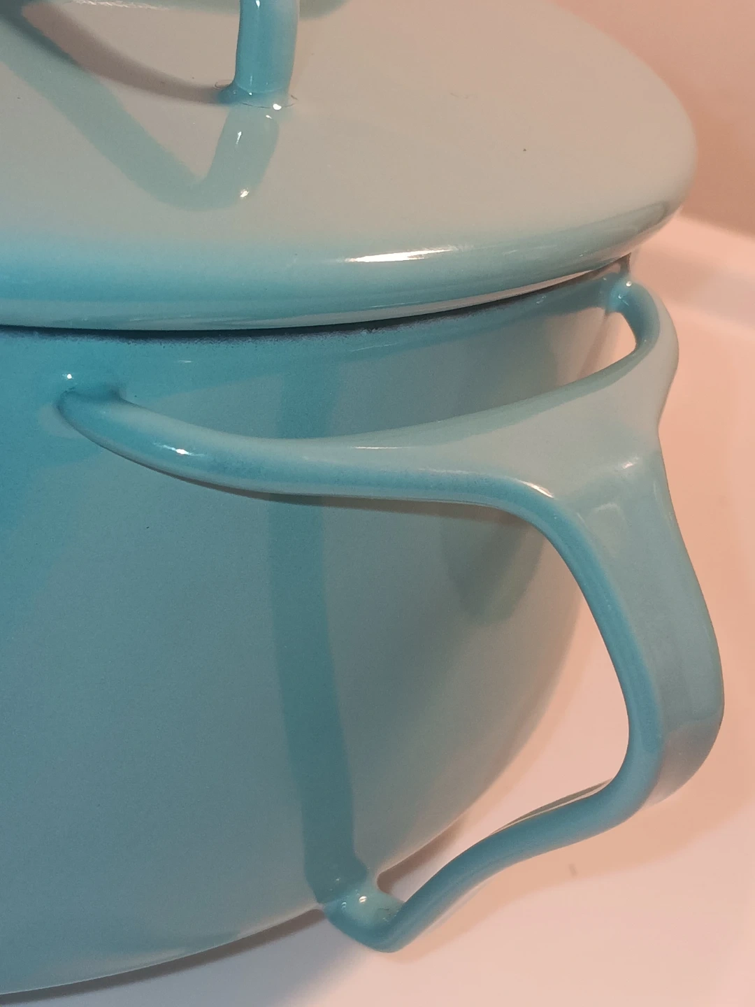 Dansk Kobenstyle 2.32 qt casserole pot with lid. Enamel coated cast iron. Teal blue exterior with white interior. Pot measures approximately 7 inches tall with lid on.