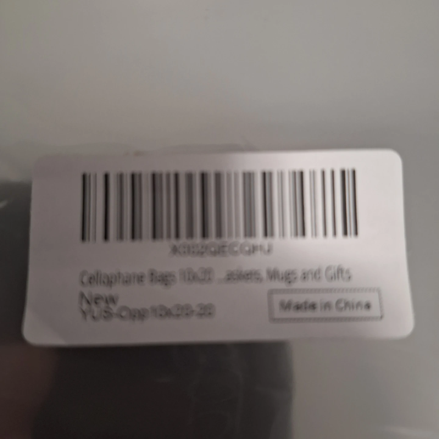 Clear cellophane bags for packaging. These are 10x20 size. They're perfect for protecting and presenting cards, mugs, and gifts. Made in China.