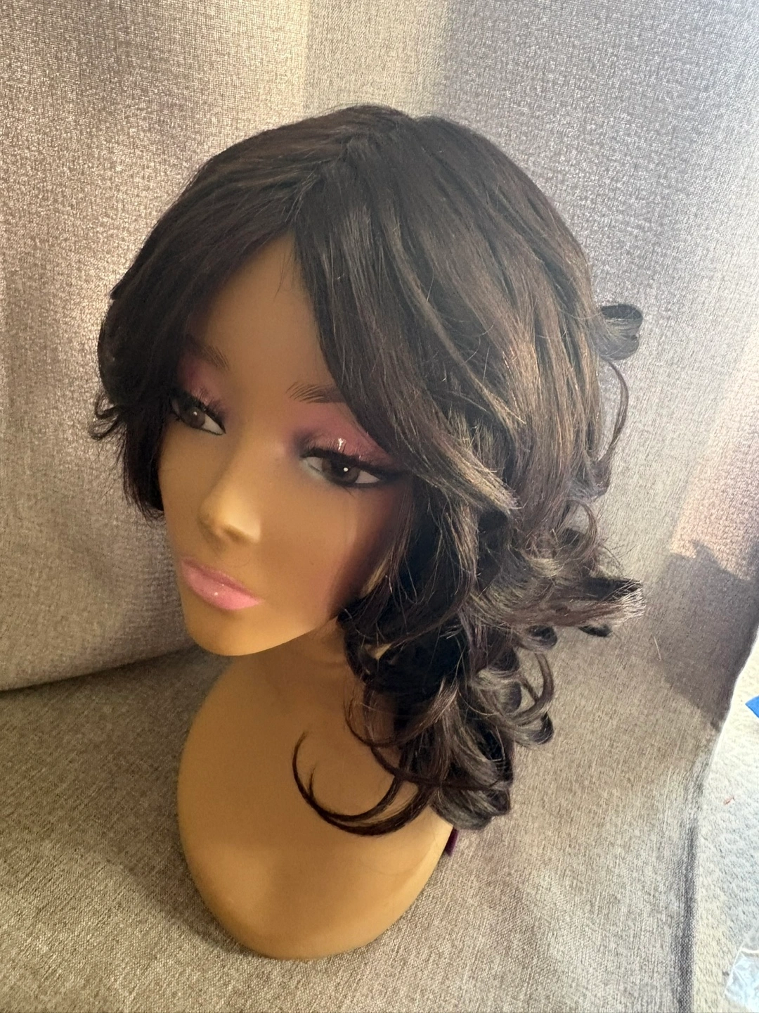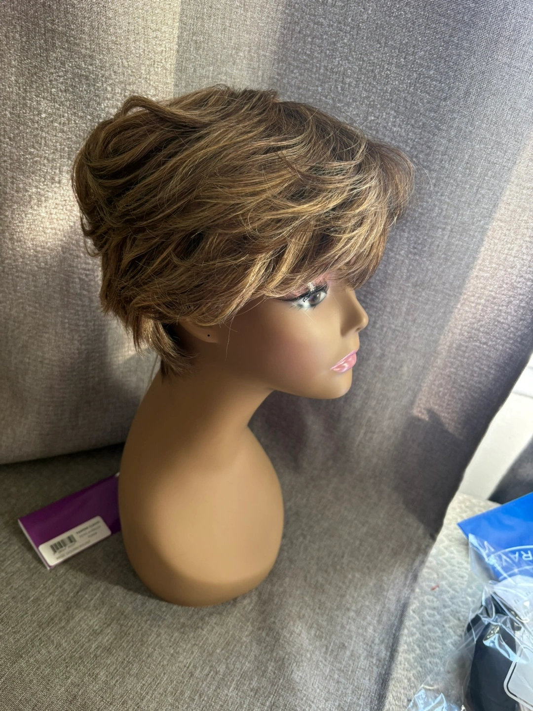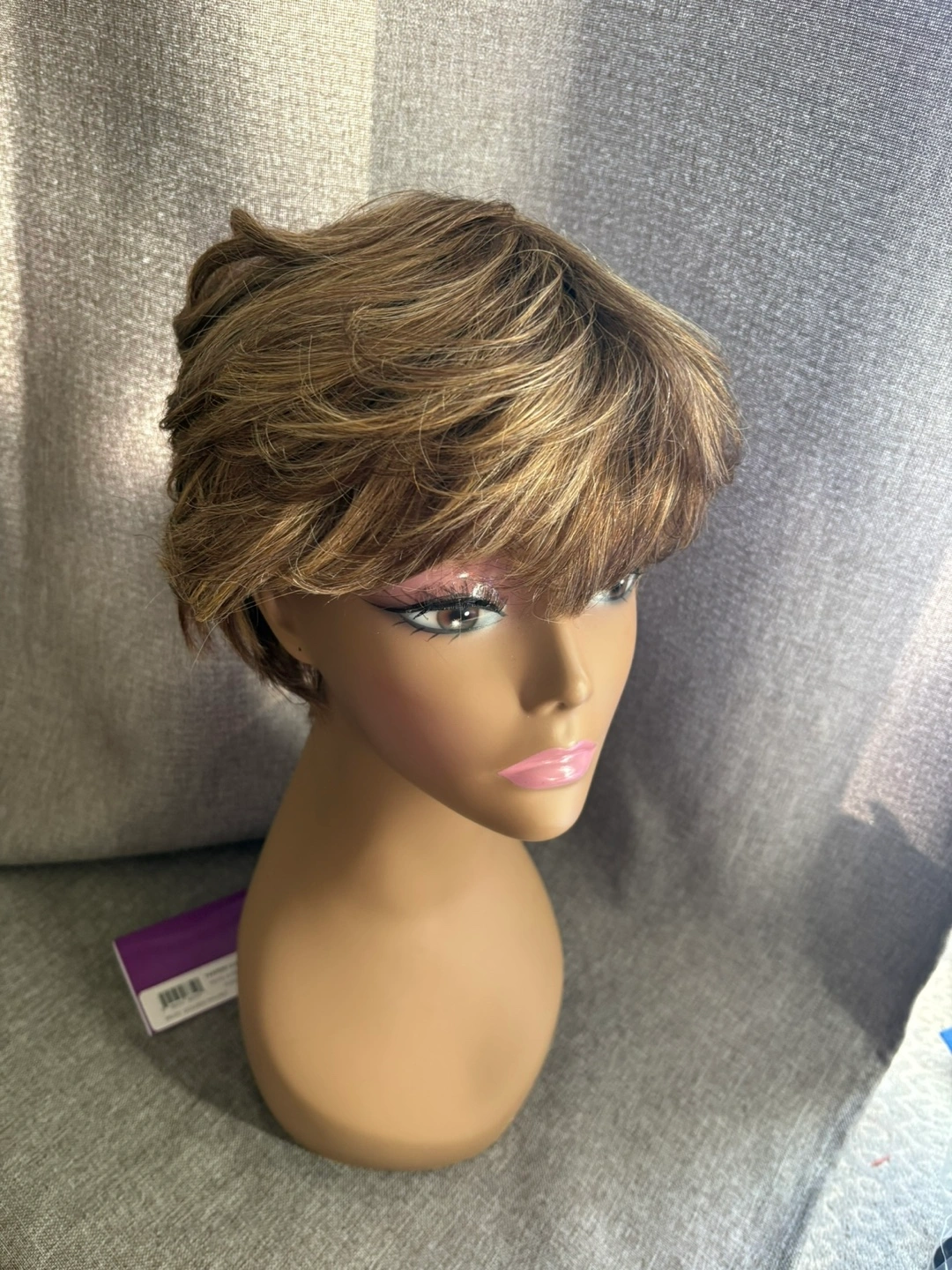 This short wig features a mix of blonde and brown highlights for a natural look. It's styled with textured layers and curls. It's great for a quick style change or everyday wear!