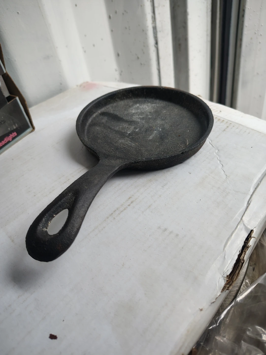 A small, durable cast iron skillet. It's perfect for single servings or small cooking tasks. This pan is made from solid cast iron. Used only once or twice I think.
