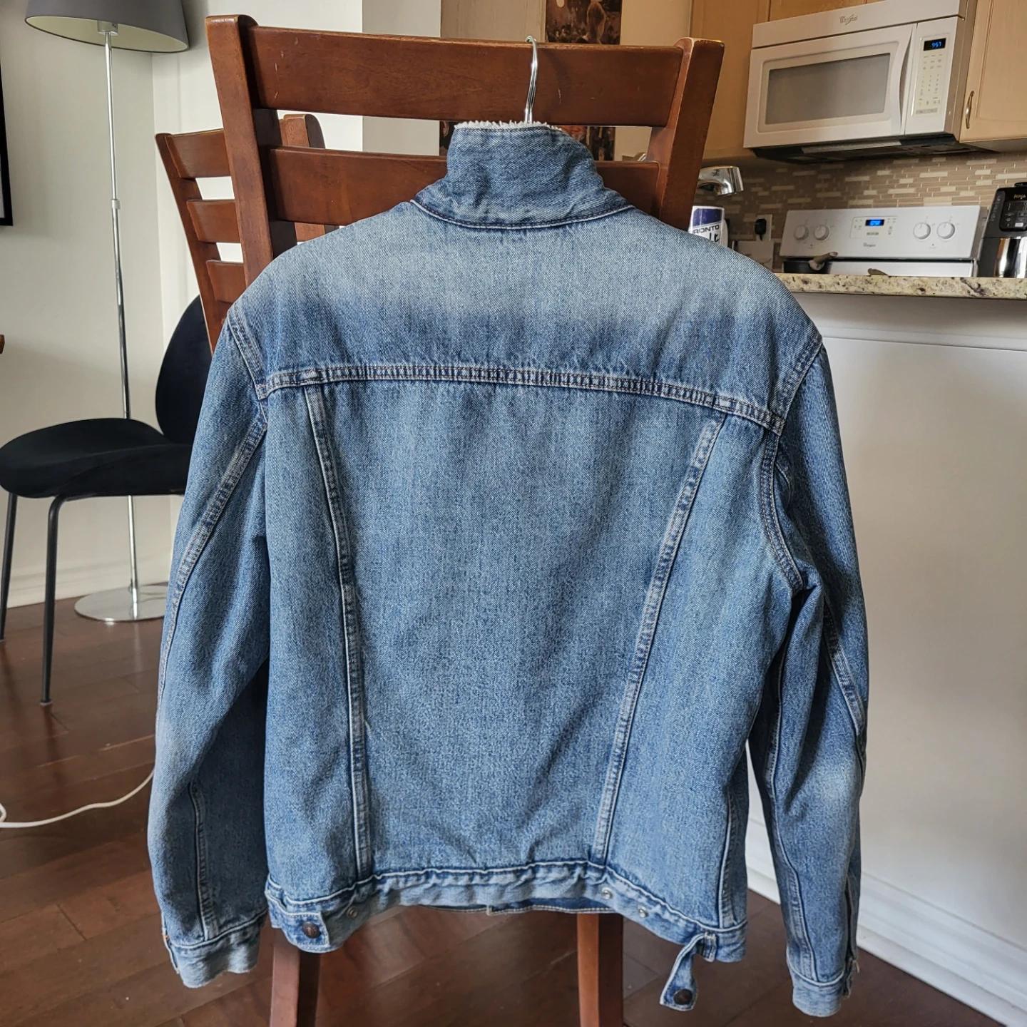 This is a Levi Strauss & Co. sherpa lined denim trucker jacket. It's a size medium with a classic blue wash. Sherpa lining provides extra warmth for cooler weather.