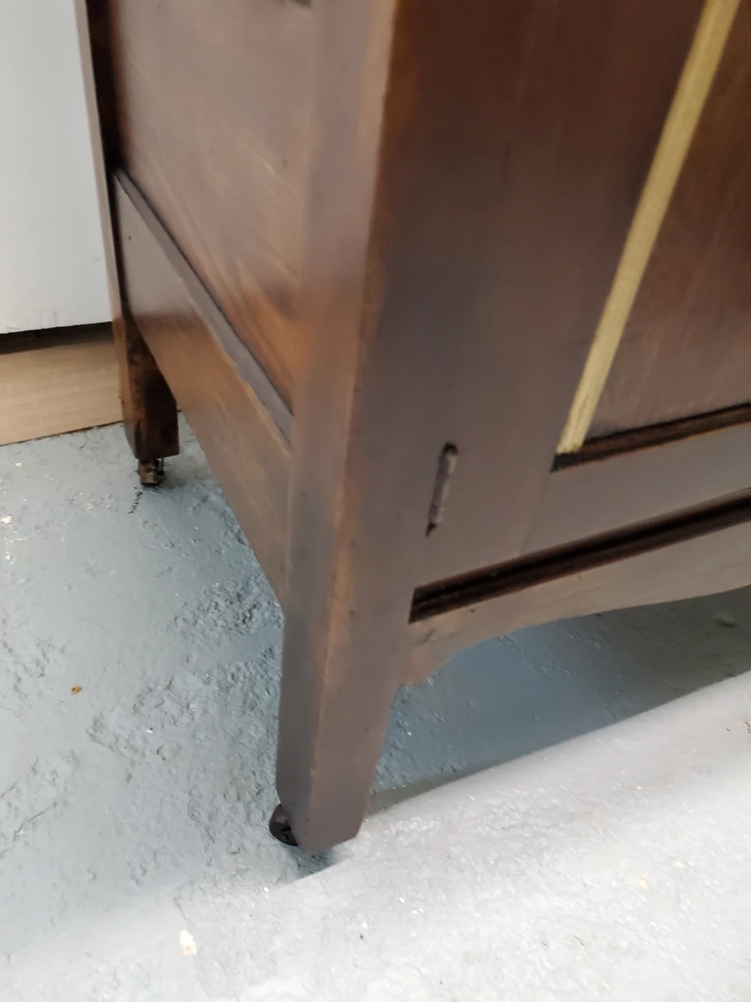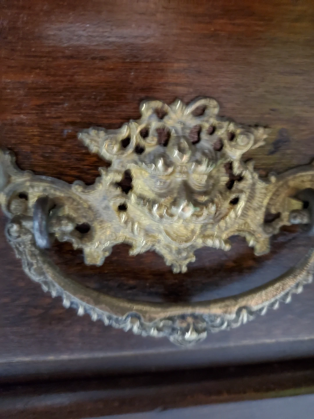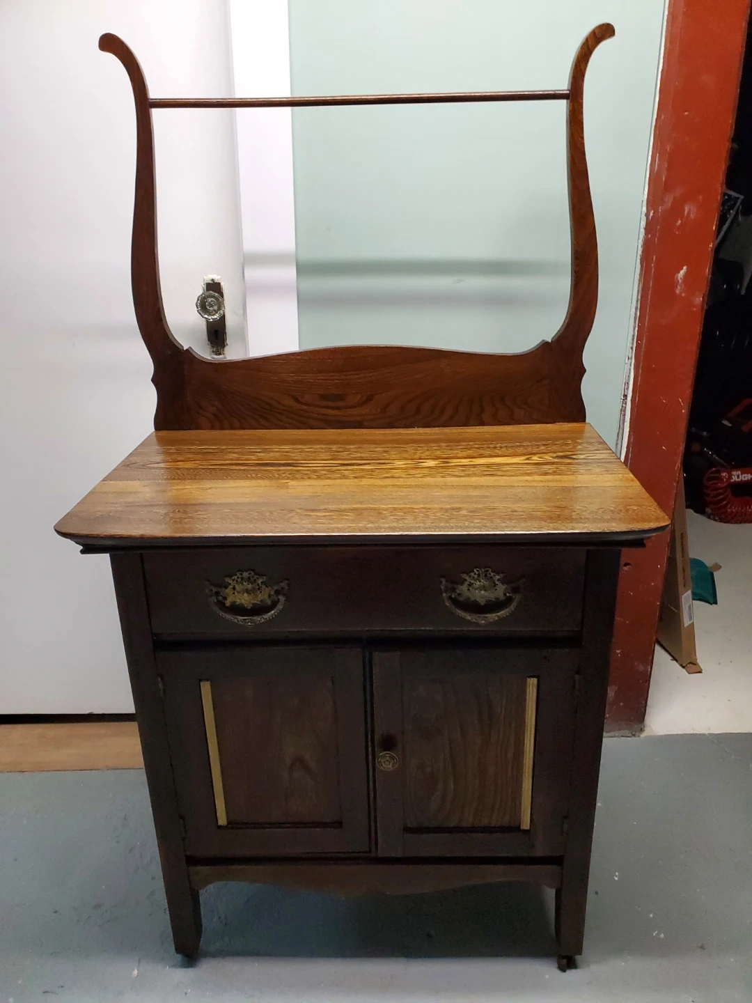 This refinished antique washstand is made of dark wood and features ornate brass drawer pulls. It measures 28 inches wide by 30 inches high, with a harp height of 22 inches. The cabinet has two doors and two drawers for storage. Would make a great coffee bar ir entryway catch all.
