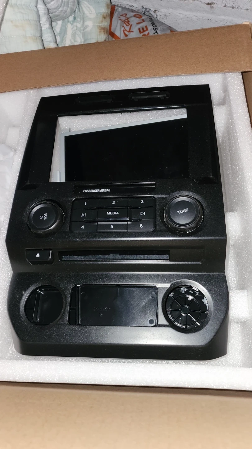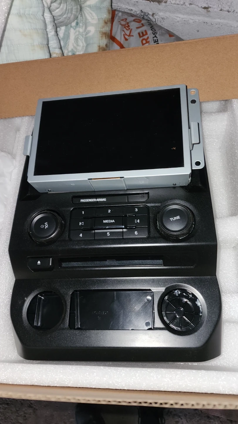 This is a car stereo and dash kit assembly. It includes a screen and controls with buttons for media and tuning. The unit is removed from 2017 f150 when upgraded to tesla screen