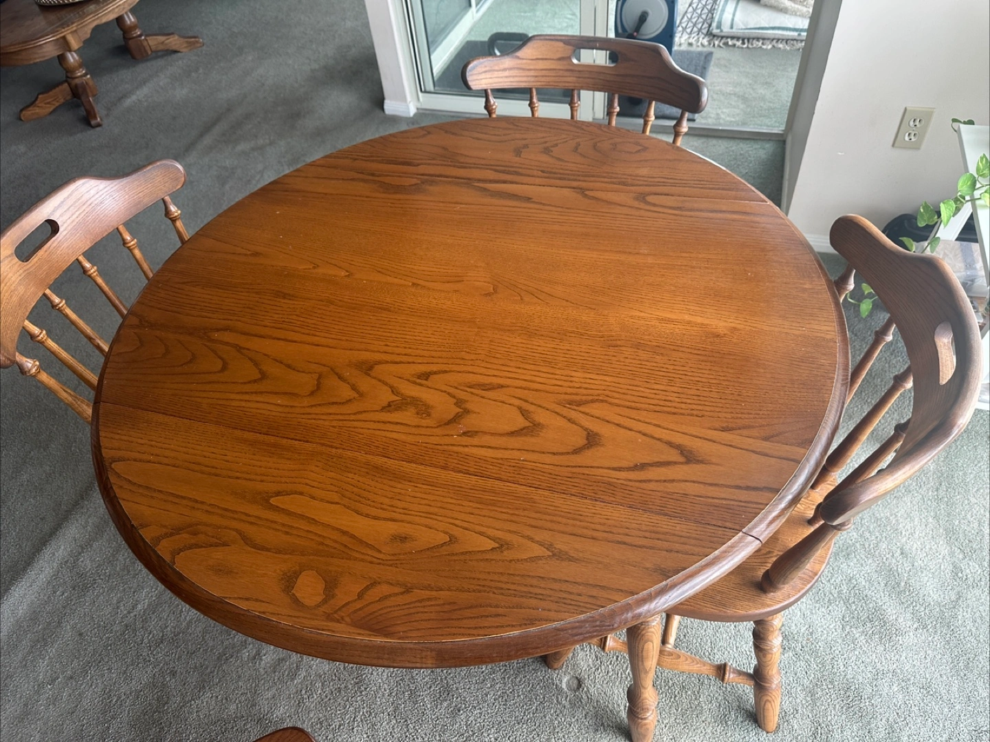 Selling a lovely wooden dining table that comes with four matching chairs. It's a great set for a small dining area or kitchen. The table and chairs are in good condition and ready for a new home. Perfect for family dinners or casual get-togethers!