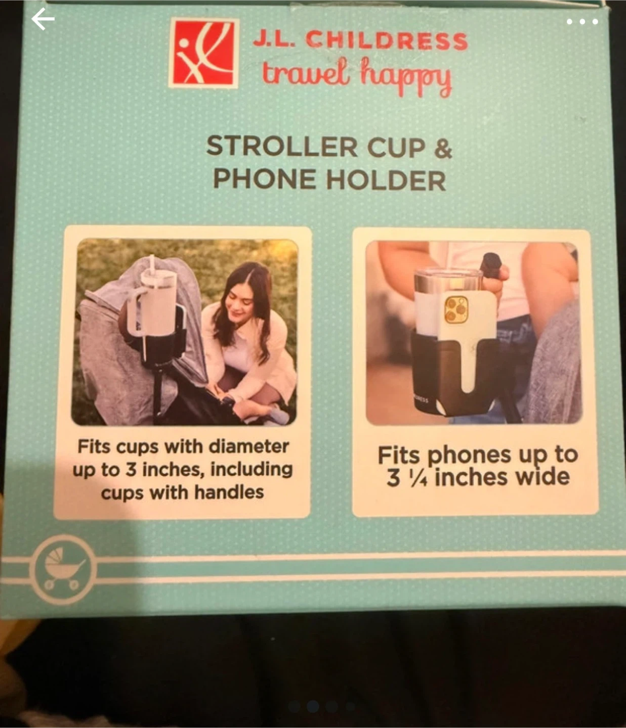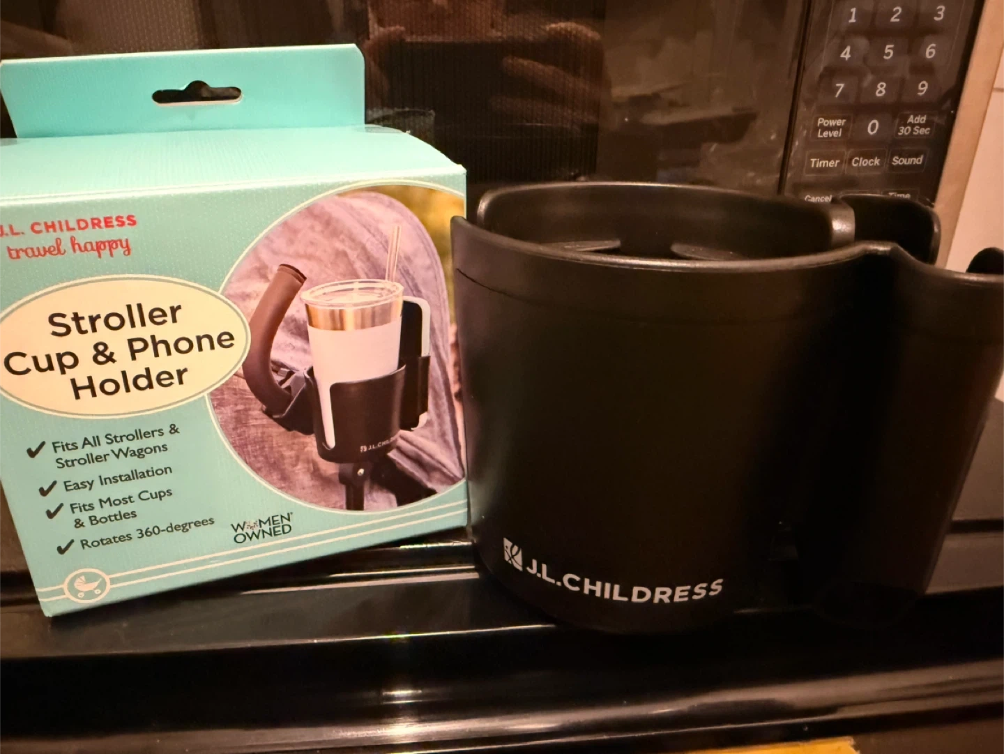 This J.L. Childress stroller cup and phone holder attaches to most strollers and wagons. It fits cups with a diameter up to 3 inches and phones up to 3 1/4 inches wide. It's easy to install and rotates 360 degrees!