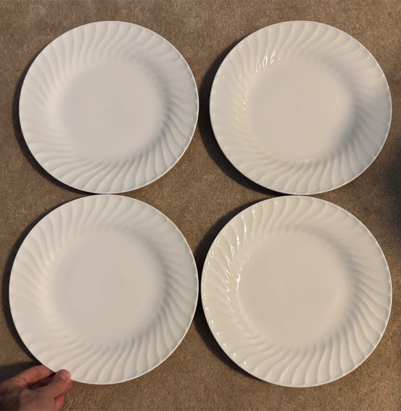 Beautiful white dinner plates with a SWIRL design (4 available). Made in China. Dishwasher safe and microwave safe. At $4 each .. all four for $15