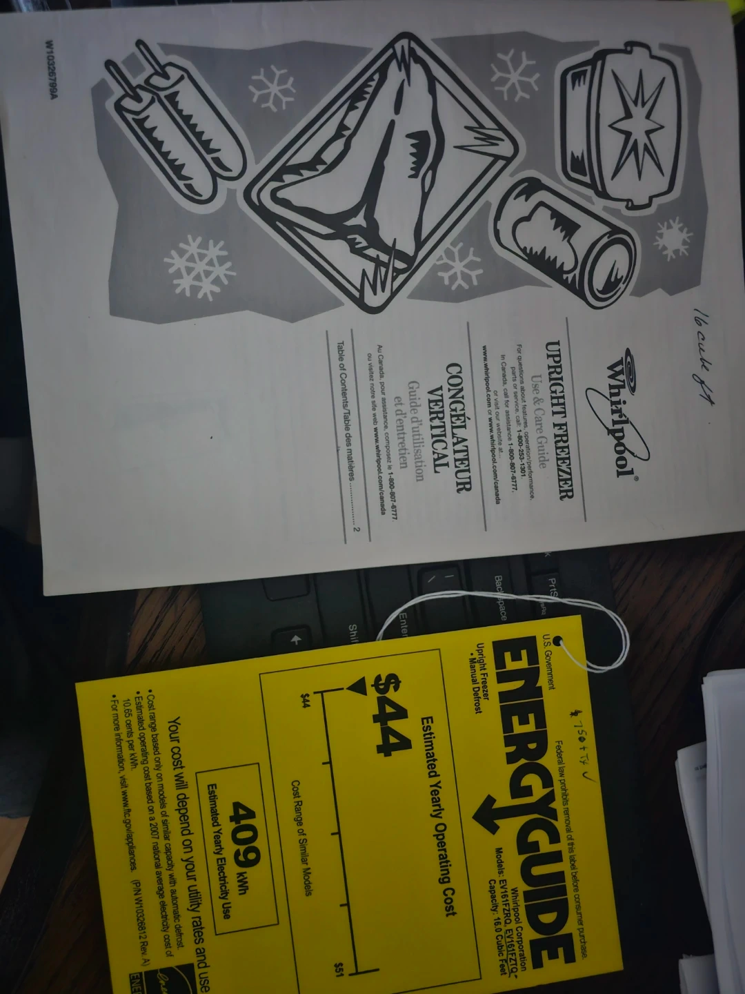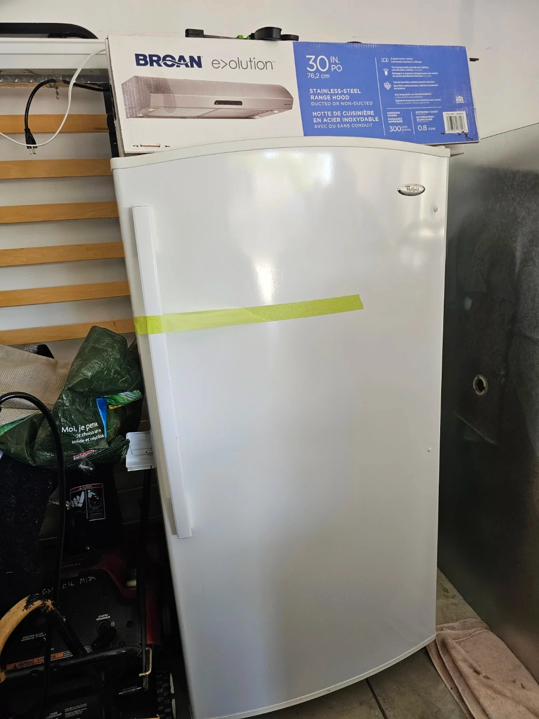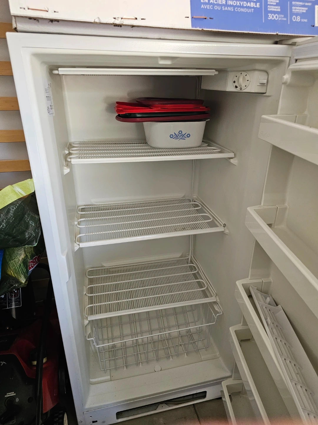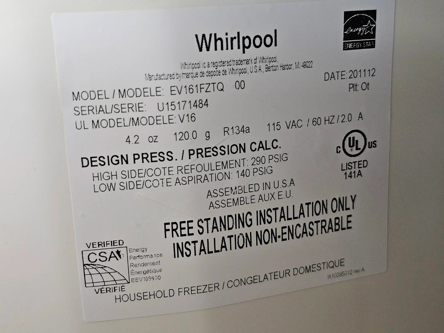 This is a white Whirlpool upright freezer. It's a free-standing model with adjustable wire shelves and baskets. The unit has a manufacturing date of November 2012.