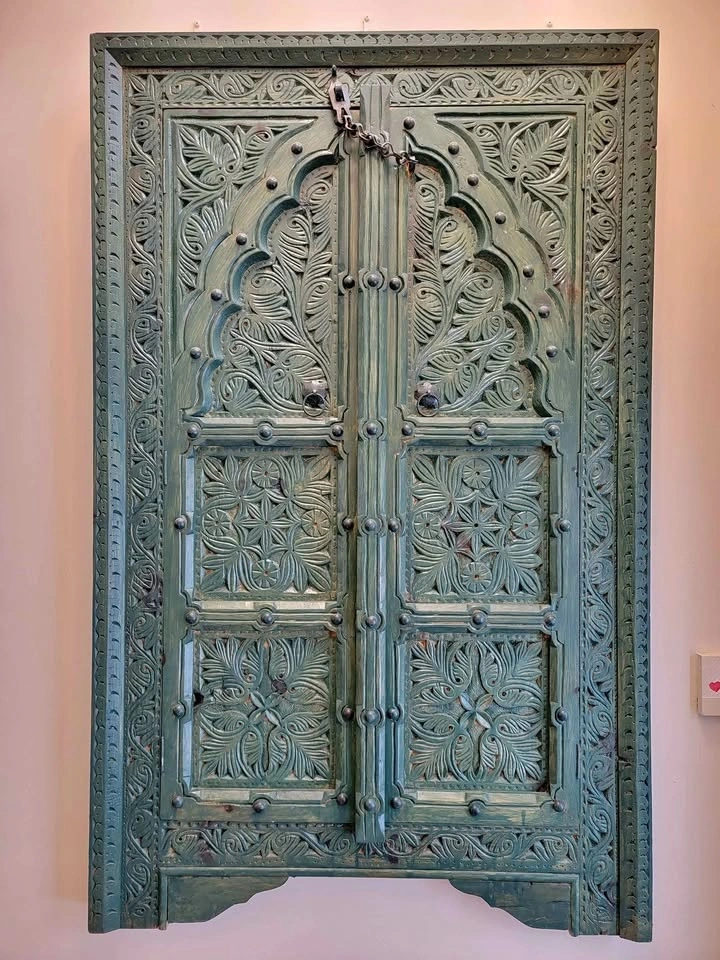 A rare and imposing architectural feature, this 5.5 feet solid wood door set is a masterclass in hand-carved artistry. Great as a decorative piece for your home, adds a vintage or bohemian vibe. Scalloped arch detailing complemented by original heavy iron chain and ring-pull hardware. Finished in a distinguished weathered verdigris, it is designed to serve as the definitive focal point of a luxury interior. Standing at almost 6 feet, it commands attention in high-ceiling spaces or grand foyers. Dimensions: Height: 66", Width: 41". Due to the substantial weight and solid wood construction, this piece requires at least two people for moving. A full-size van or pickup truck is necessary for transport. Please bring furniture blankets or padding to protect the carved relief during transit.