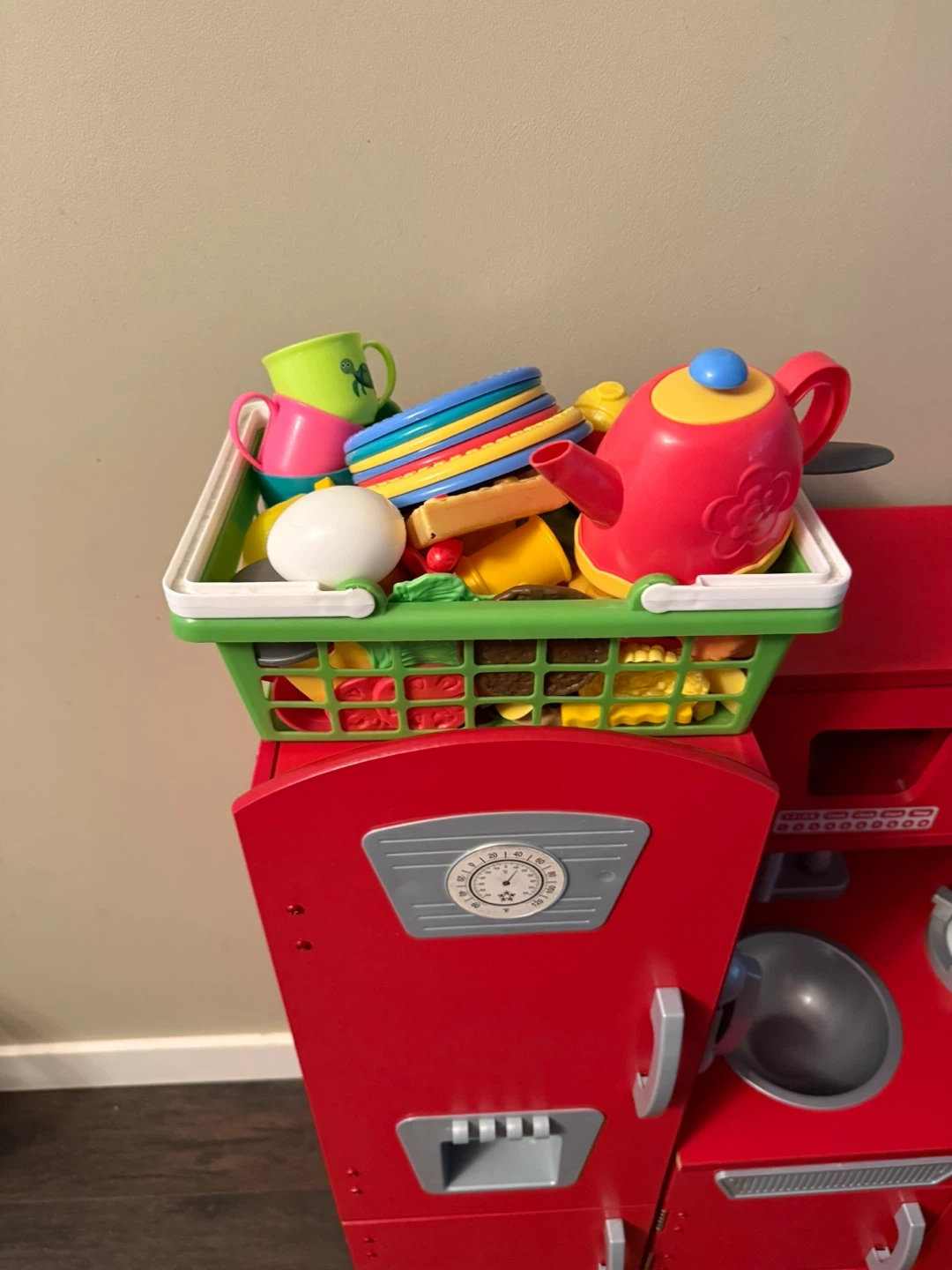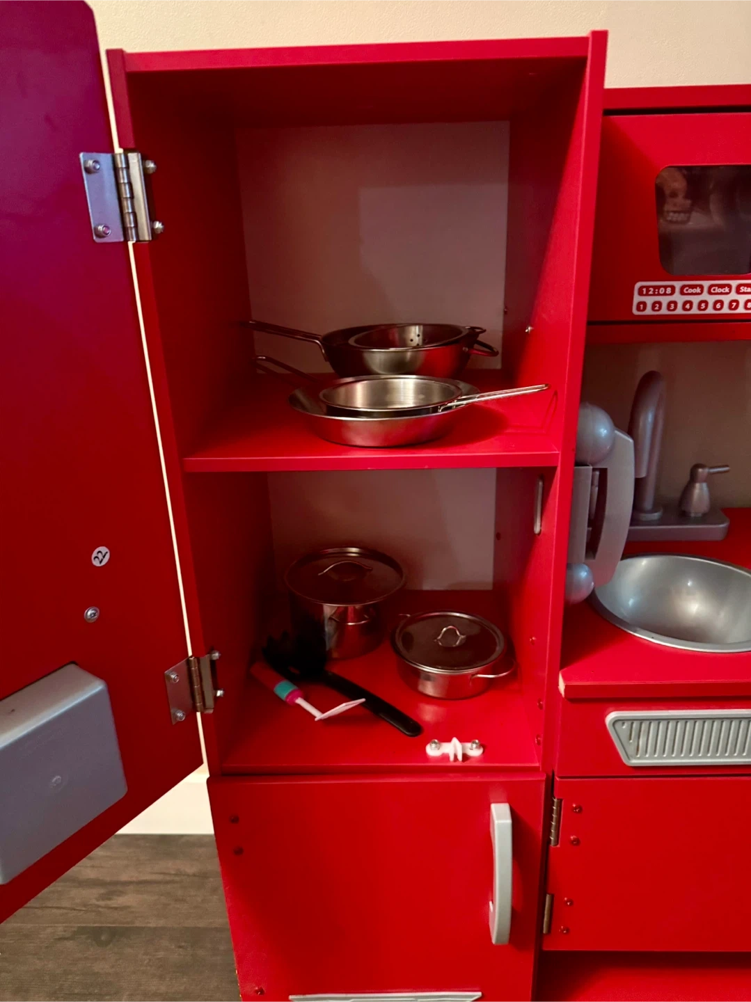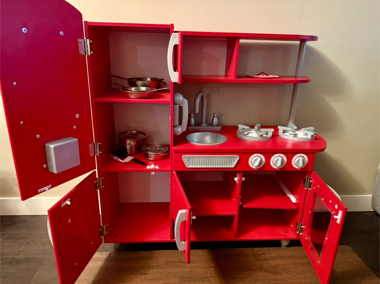 Red wooden play kitchen from KidKraft. It includes a fridge, oven, microwave, sink, and stovetop. It also comes with a basket full of play food and kitchen accessories (pots and pans). It's perfect for little chefs to explore their culinary creativity!
