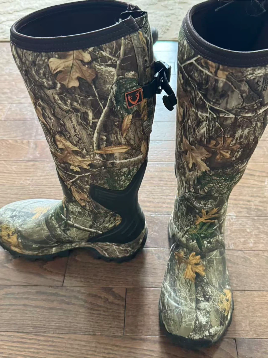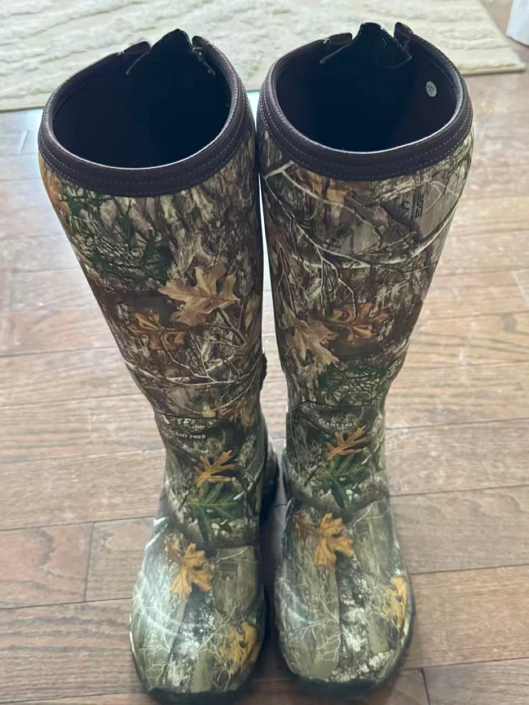 Huntshield Northern Range Hybrid Trekker boots in a camouflage pattern. Men's size 9 US. Made in China. These boots offer warmth and protection for outdoor activities.