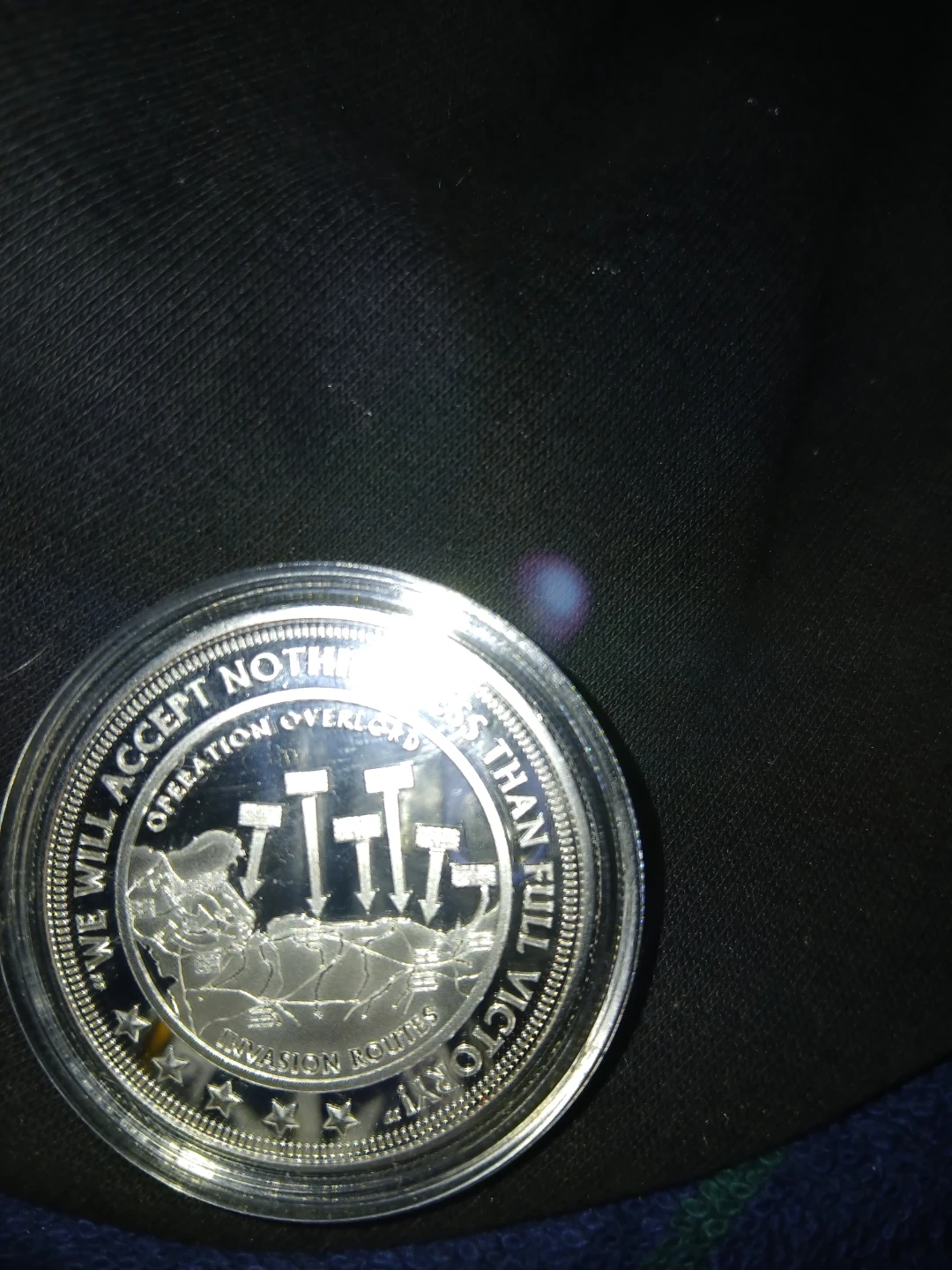 Commemorative coin celebrating D-Day and World War II. Features "Normandy D-Day June 6, 1944" and "World War II" on one side. The reverse side reads "We Will Accept Nothing Less Than Full Victory" and "Operation Overlord" with an image of airborne troops. A great piece for history collectors! B/o