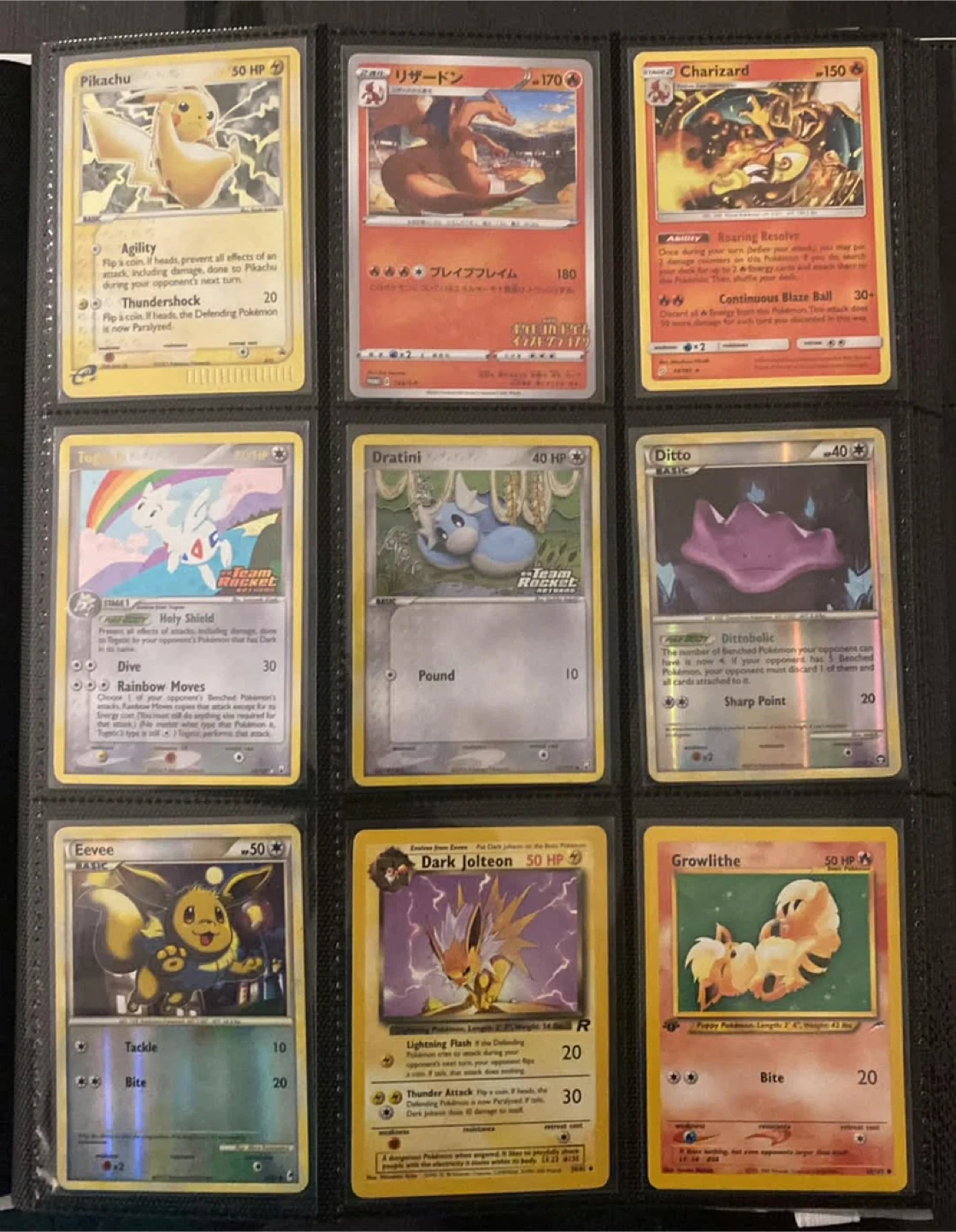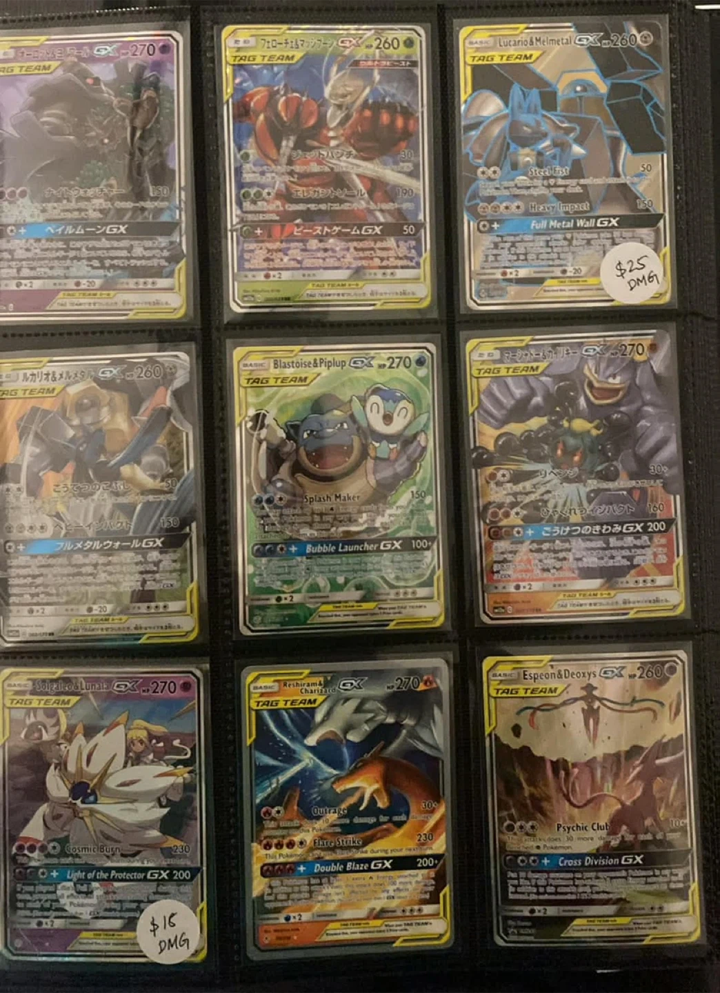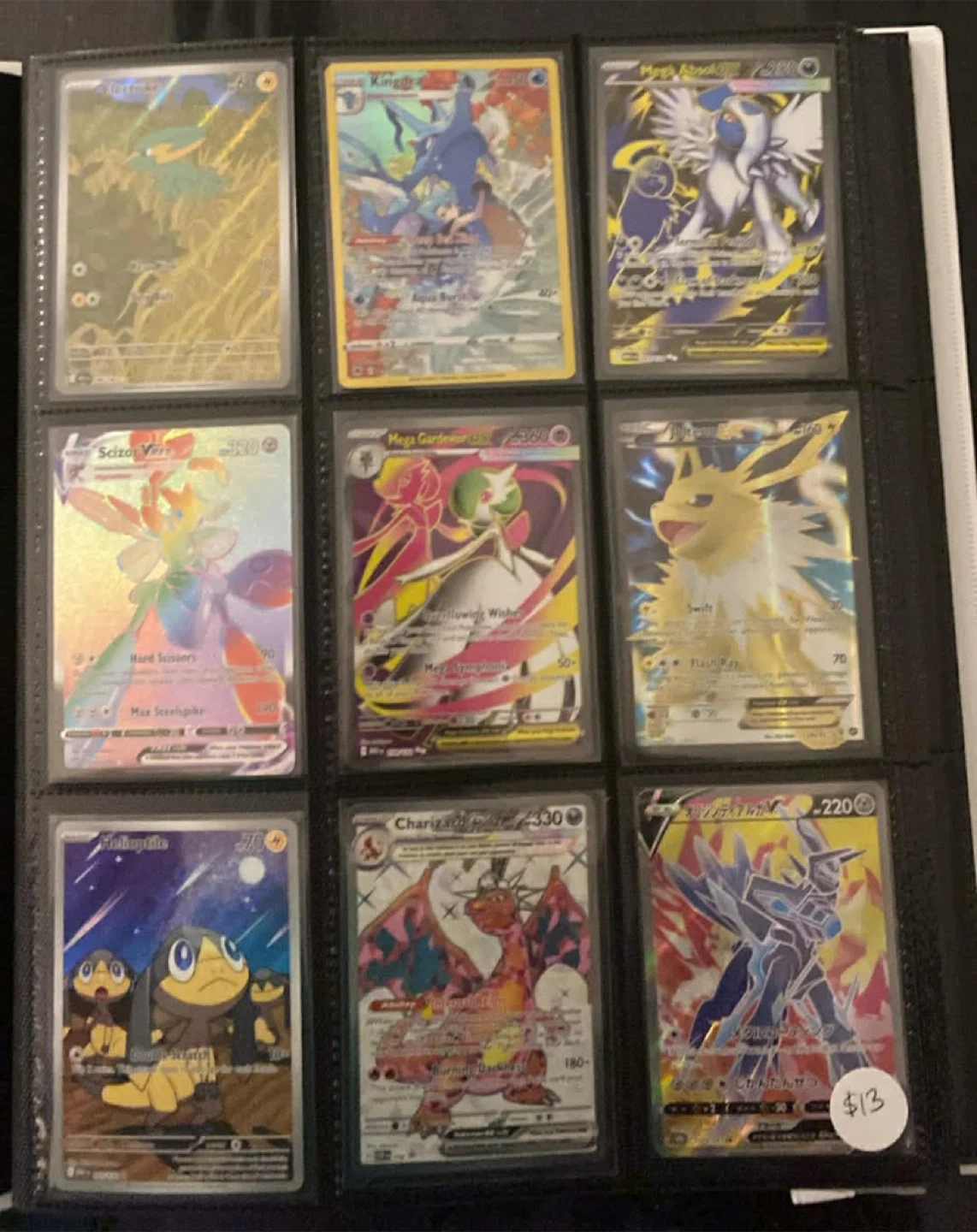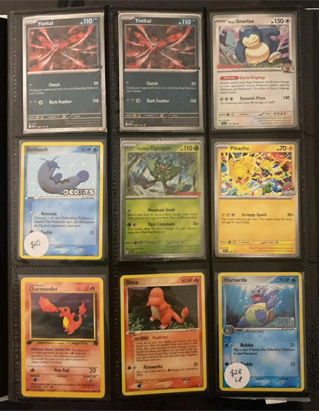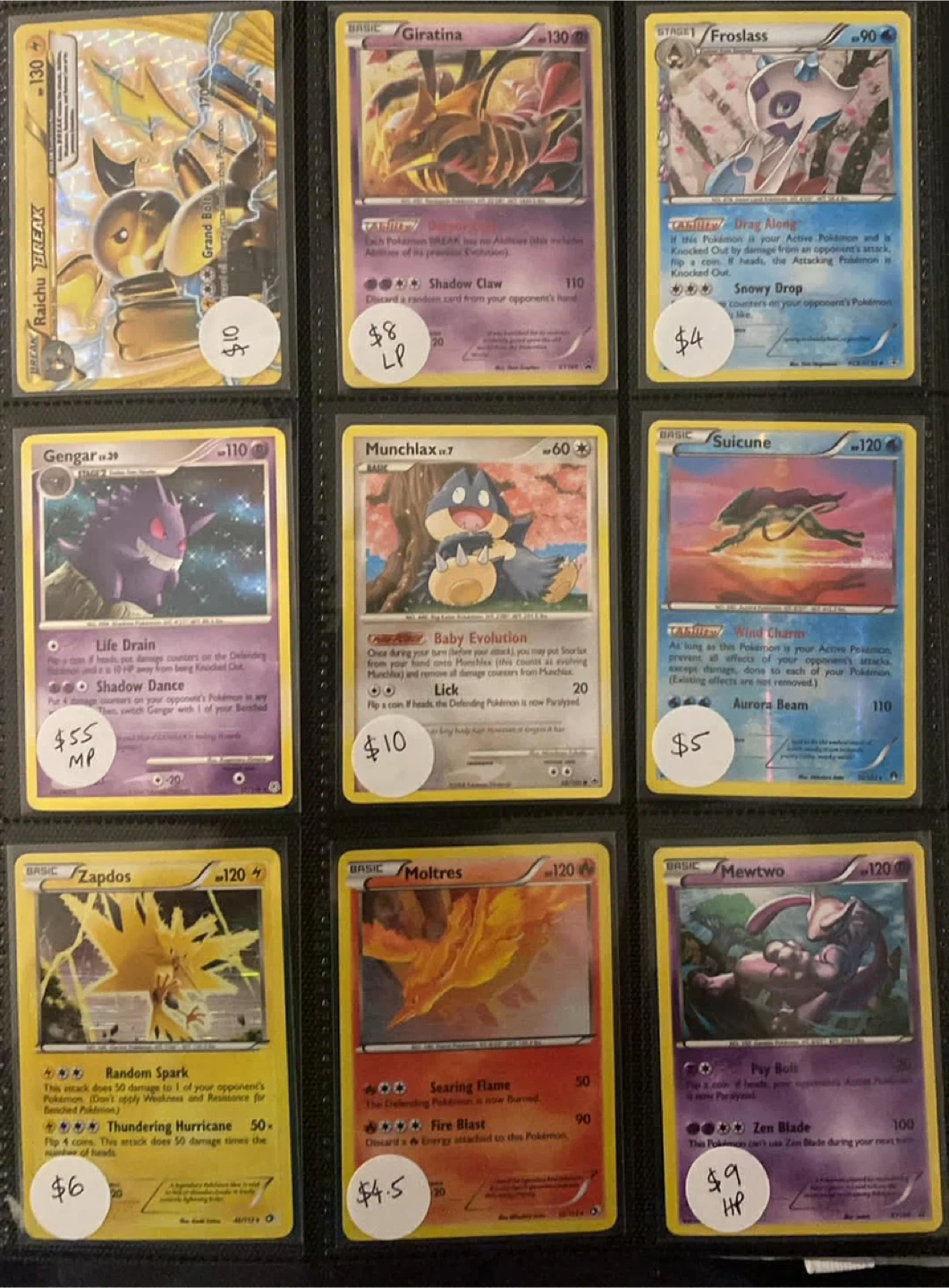 Collection of various Pokémon trading cards featuring multiple Pokémon characters and card types. These cards are great for collectors and players alike. Some cards have individual pricing noted on them.