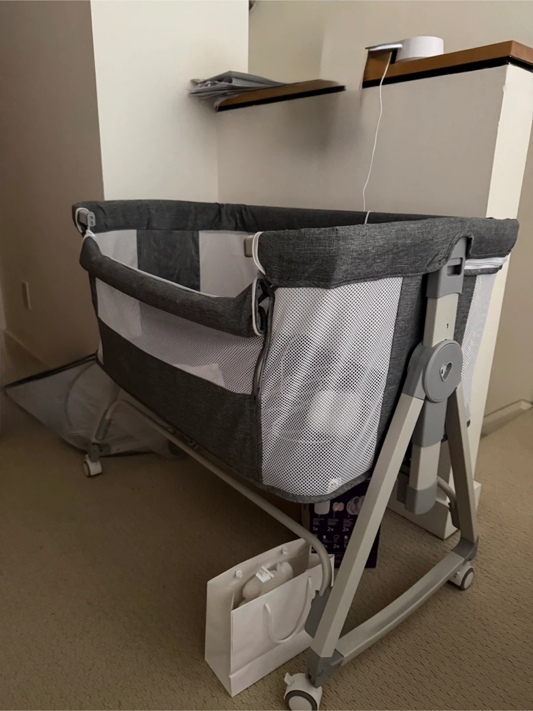 This bassinet is designed for infants. It features mesh sides for breathability and comes with a mosquito net for added protection. The bassinet is grey and has a lightweight frame with wheels for easy movement. It's suitable for newborns and younger babies.