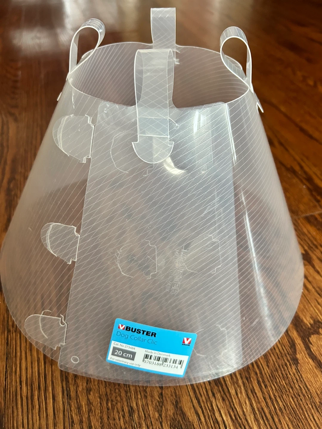 This is a Buster Dog Collar Clic with a 20 cm measurement. It's made in Denmark for veterinary use. This collar helps prevent pets from worsening wounds or injuries by licking or chewing.