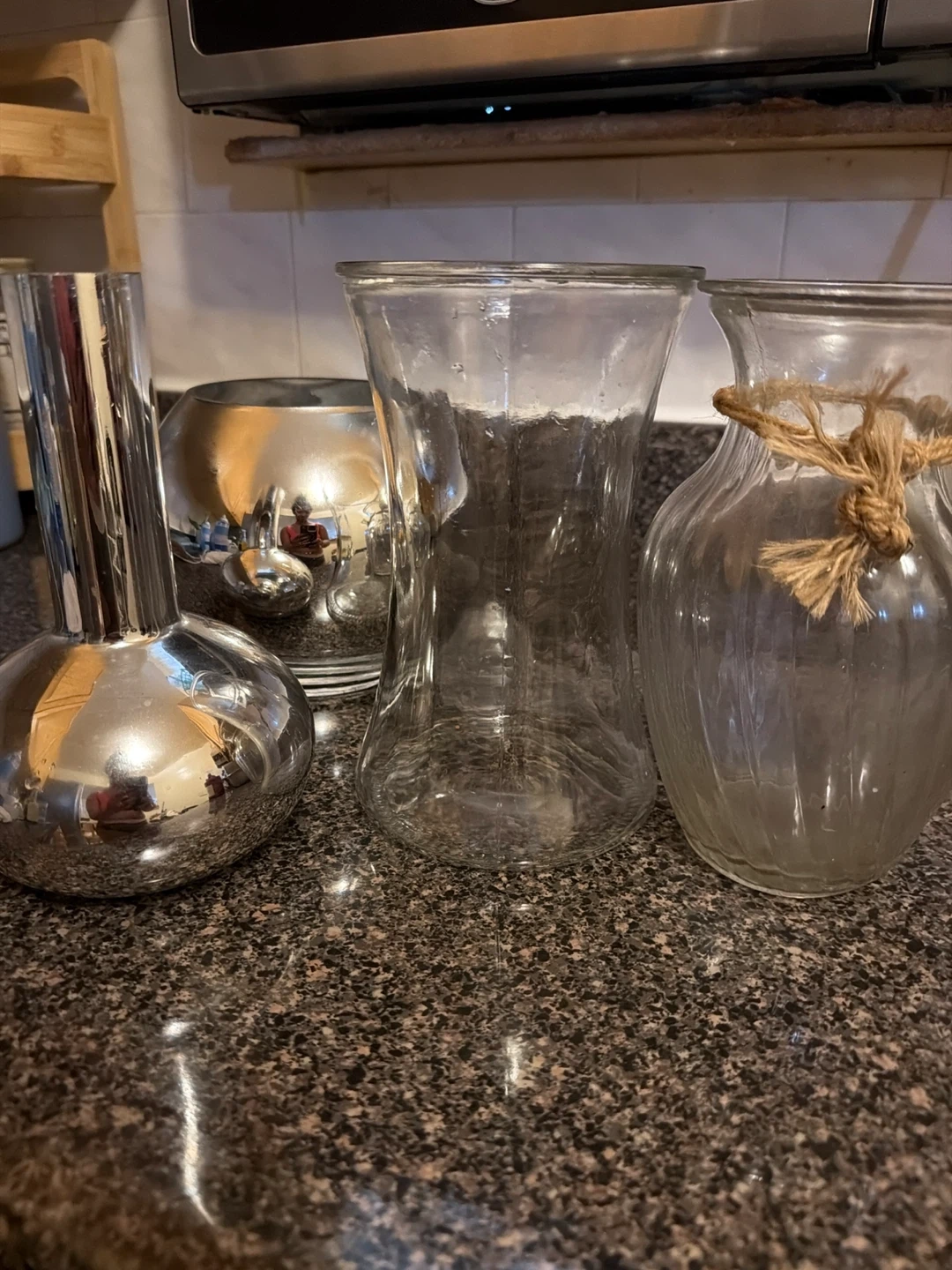 Selling a set of four unique vases! There's a silver, round vase, a silver and clear vase, a clear glass vase, and a clear glass vase with a rope accent. They're perfect for adding a touch of style to any room