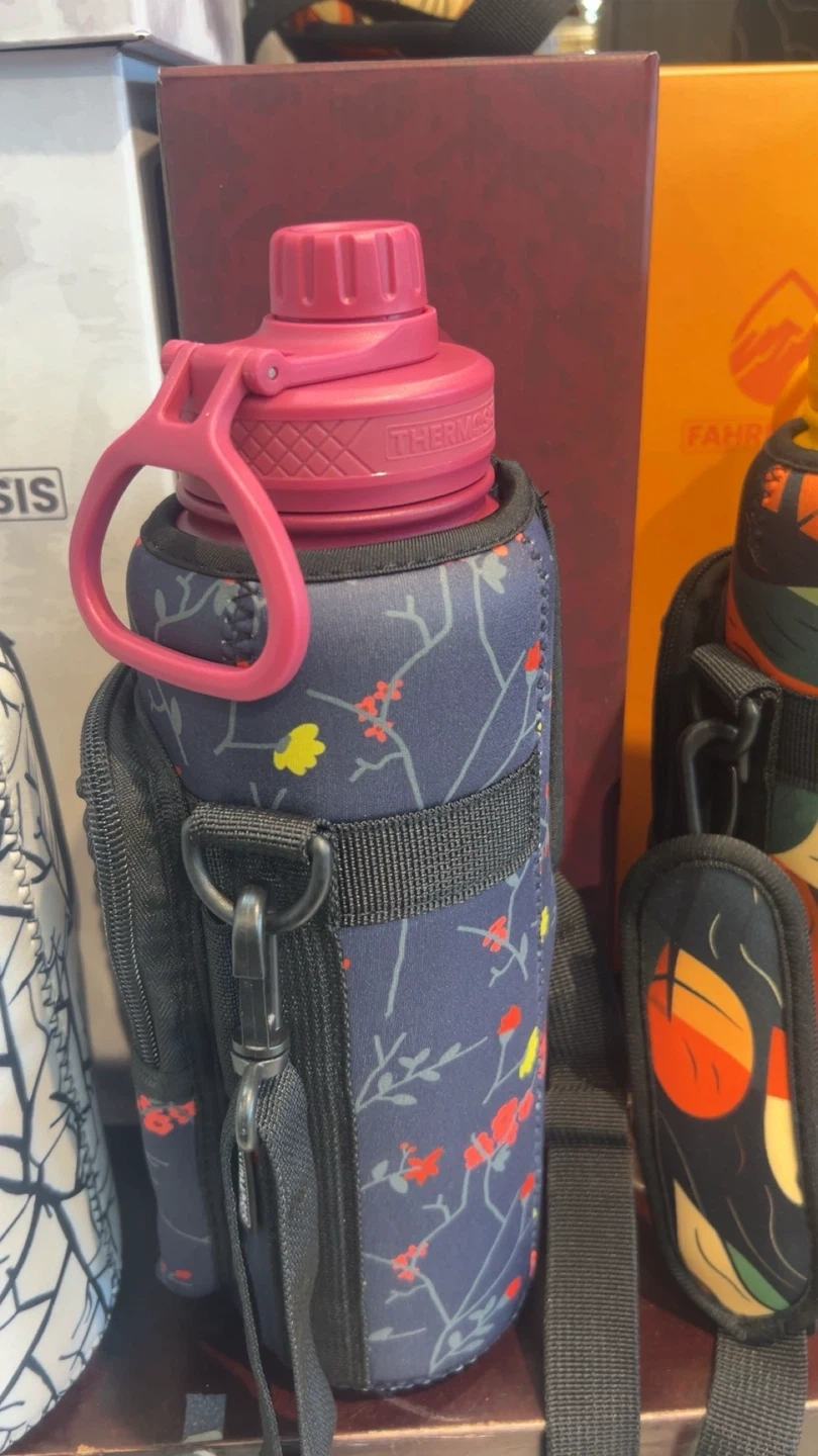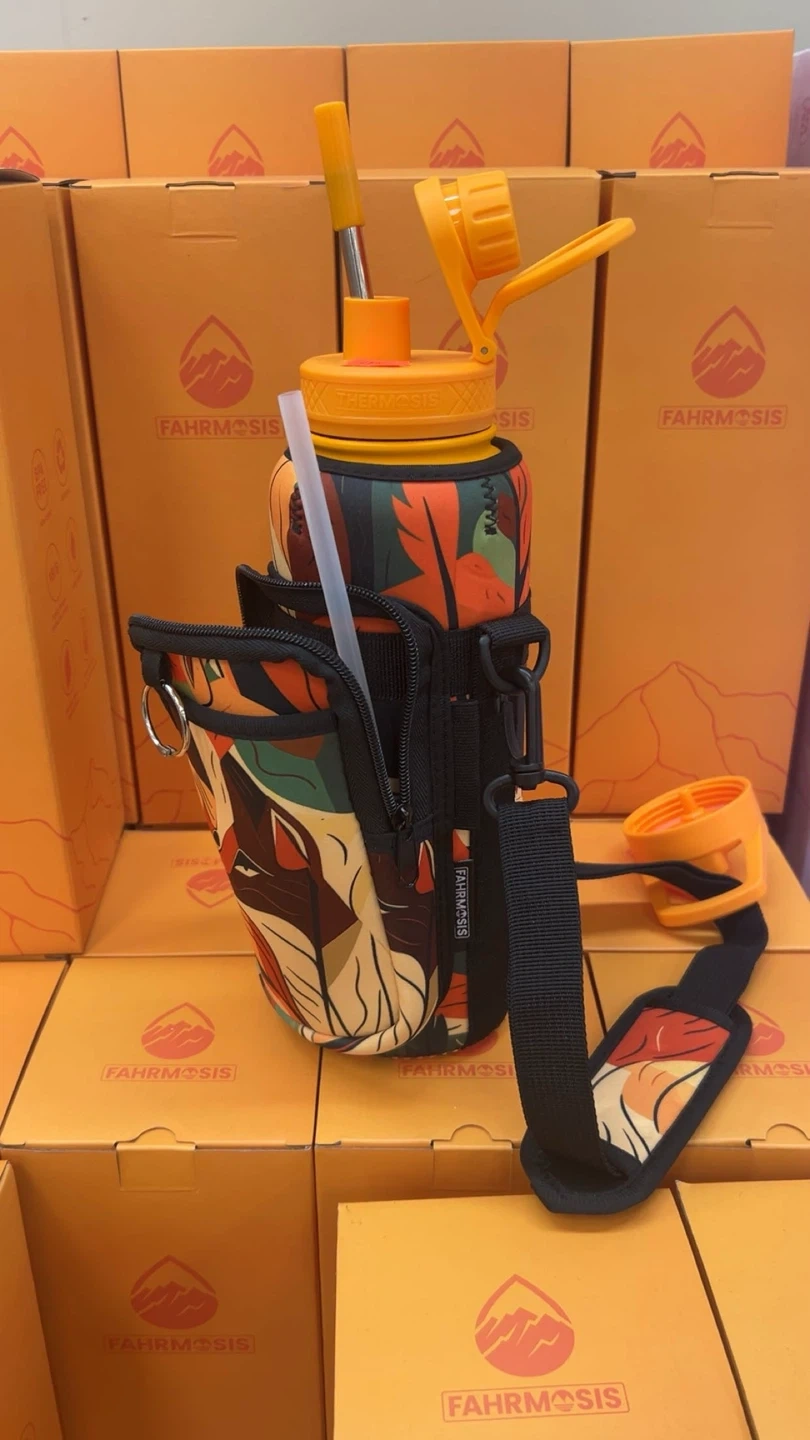 Thermosis water bottles are available in various sizes and colours, including 64oz and 40oz options. They come with a protective neoprene sleeve and an adjustable shoulder strap for easy carrying. Some models include a straw and pouch for small items.
