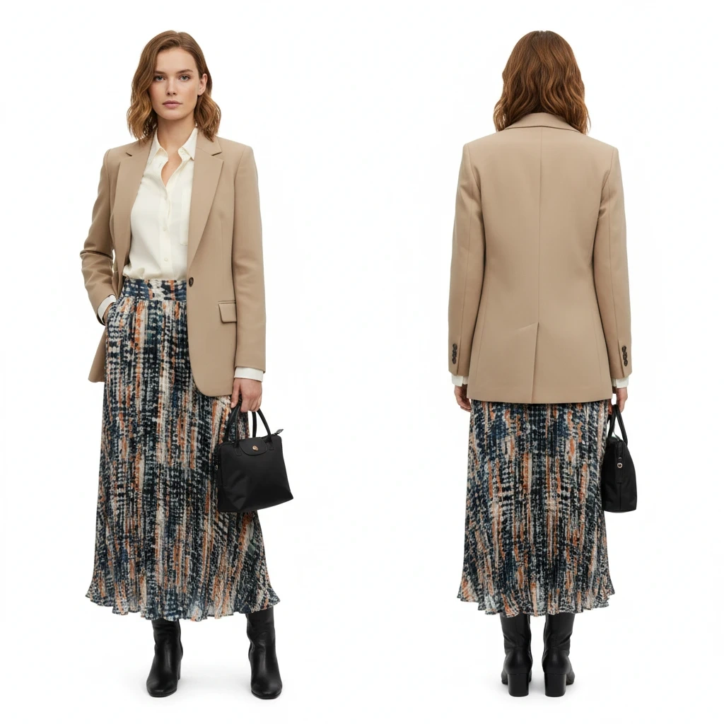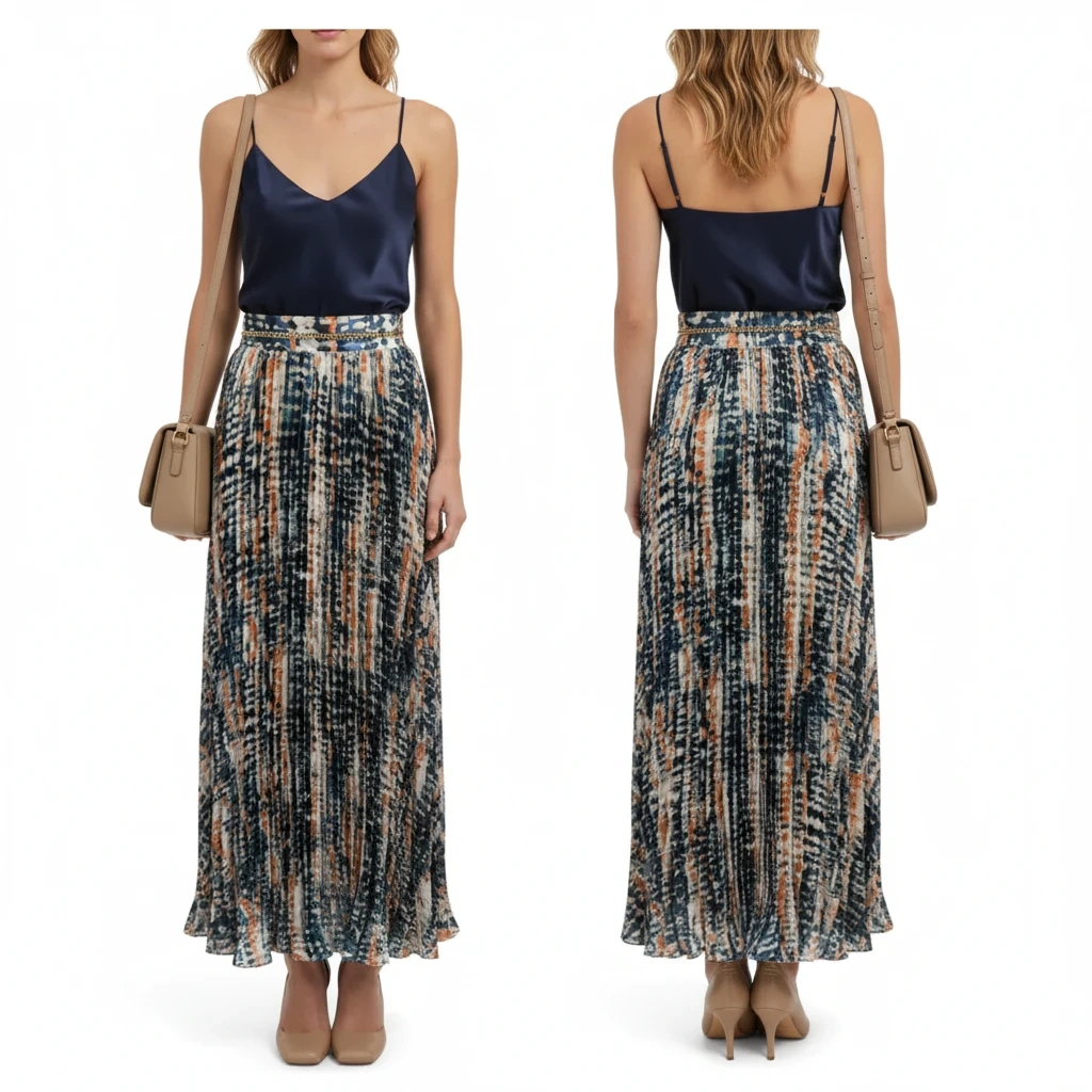 Design: Full-length maxi silhouette with a high-waisted fit. Concealed side zip closure
