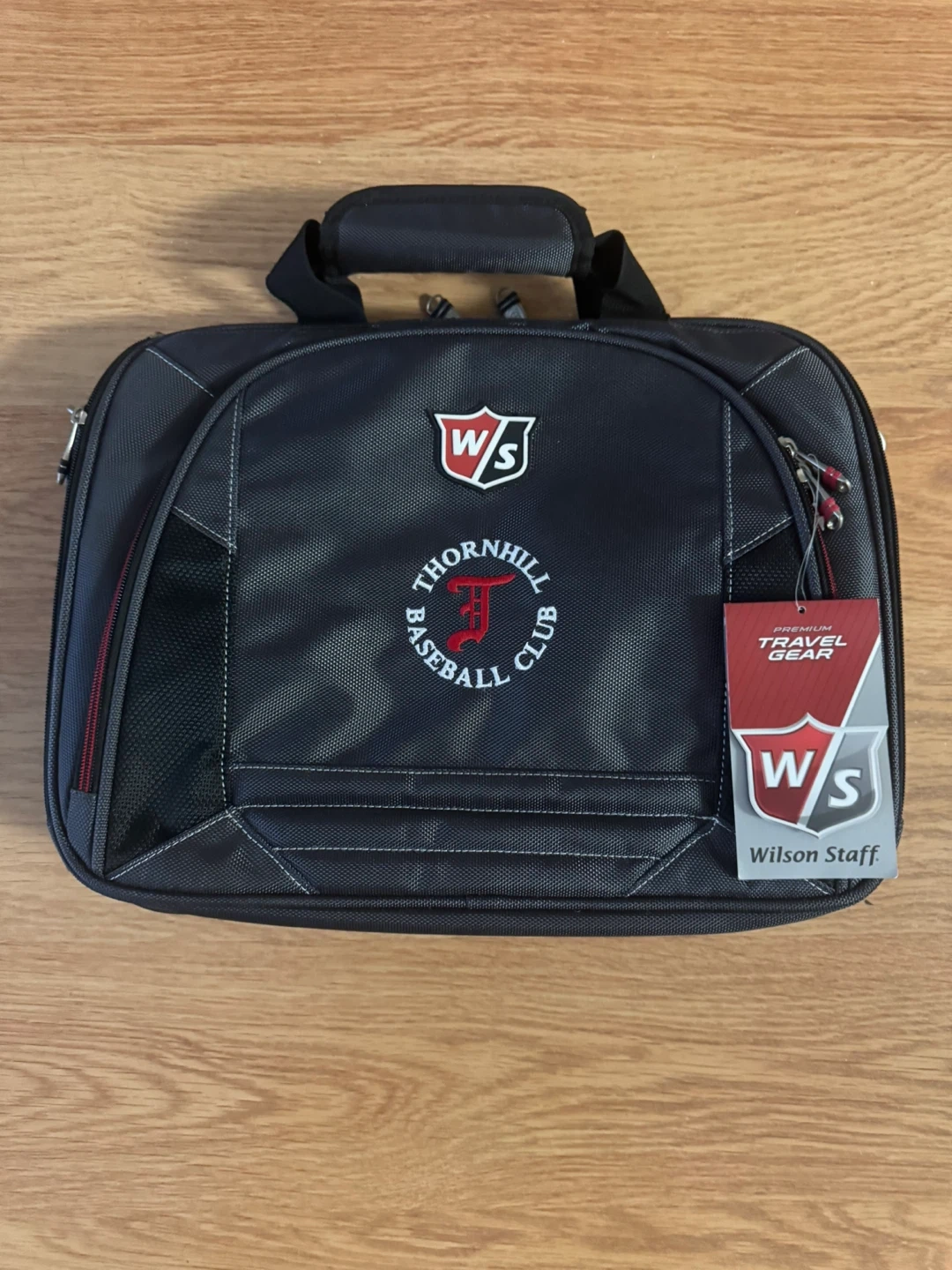 This is a Wilson Staff travel gear/laptop bag with Thornhill Baseball Club logo. It's a durable black bag with red accents and zipper details. It includes multiple compartments for organization.