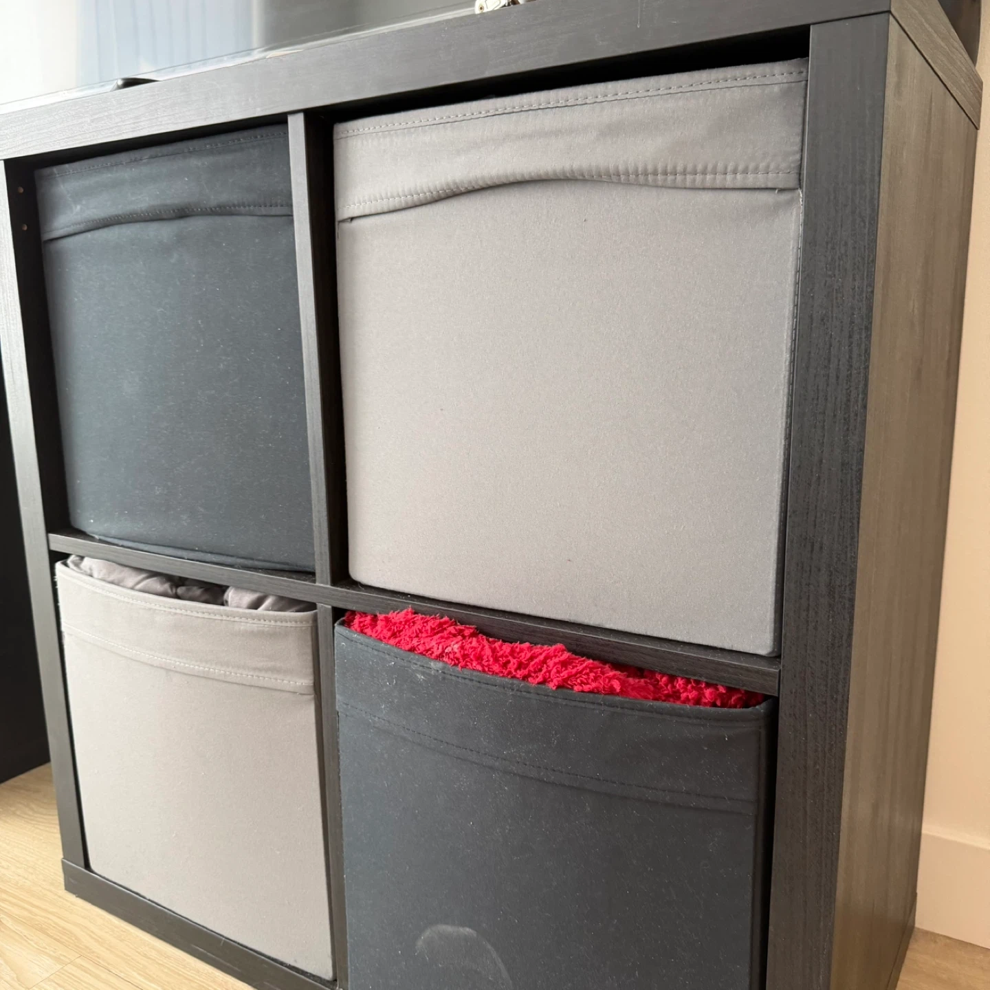 This IKEA Kallax unit has a black finish and comes with four fabric storage cubes.